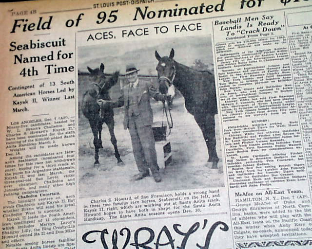AI notes: The March 2, 1940 Santa Anita Handicap became one of the most celebrated races in American turf history when the 7-year-old Seabiscuit, carrying high weight and returning from a career-threatening injury, finally captured the one prize that had eluded him after two heartbreaking runner-up finishes in earlier years. With Red Pollard back in the saddle after his own long recovery, Seabiscuit stalked the pace before unleashing a perfectly timed stretch run that brought him past his brilliant stablemate Kayak II and the rest of the field to win by about a length before a roaring crowd of roughly 78,000 at Santa Anita Park. The victory—seen as the culmination of trainer Tom Smith’s meticulous preparation and owner Charles S. Howard’s unwavering faith—instantly became a national sensation, symbolizing perseverance and redemption at the end of the Depression era and securing Seabiscuit’s place as one of the greatest racehorses in American history.