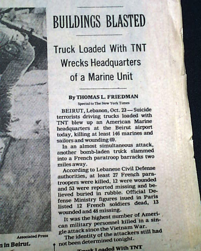 AI notes: On October 23, 1983, Beirut, Lebanon, was rocked by a devastating suicide truck bombing targeting the U.S. Marine barracks, killing 241 American servicemen and wounding over 100. This attack occurred during the Lebanese Civil War, as part of a multinational peacekeeping mission in Beirut following the Israeli invasion of Lebanon in 1982. The bomb, detonated by a vehicle laden with explosives, demolished the Marine compound in the Beirut International Airport area. Simultaneously, a separate bombing at the French military barracks killed 58 paratroopers. The assaults were widely believed to be orchestrated by Hezbollah, with backing from Iran, signaling the rising threat of militant groups in the region. The incident marked one of the deadliest single attacks on U.S. forces abroad and prompted a reevaluation of American military strategy in Lebanon.