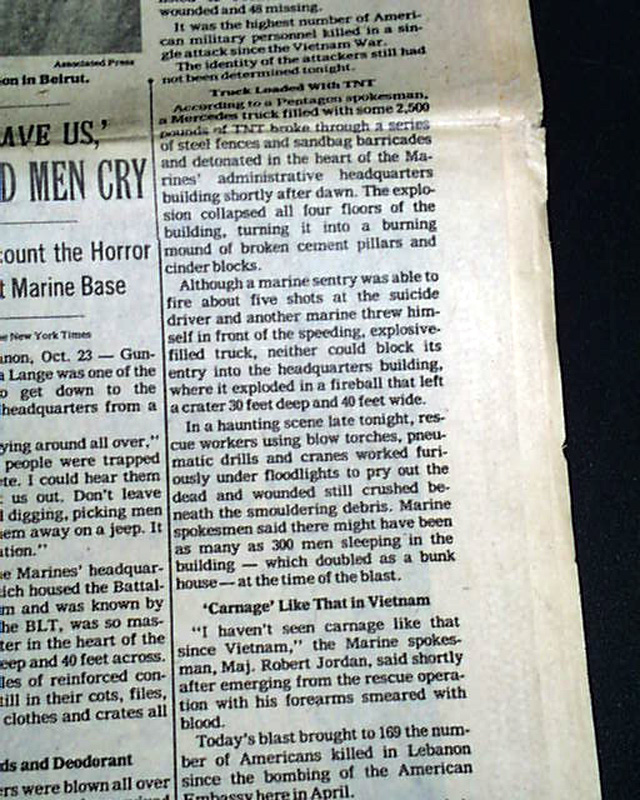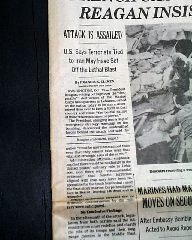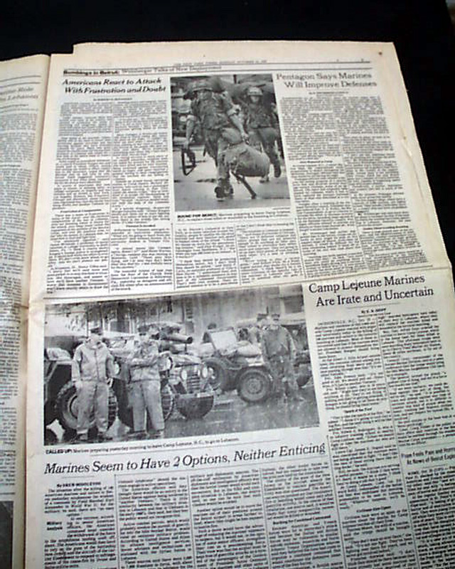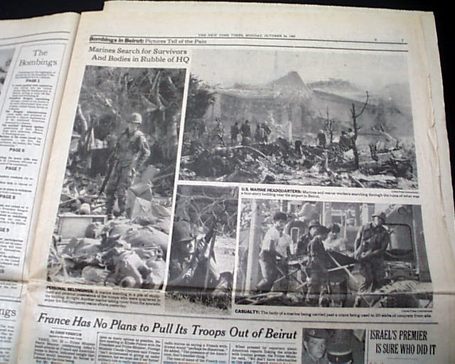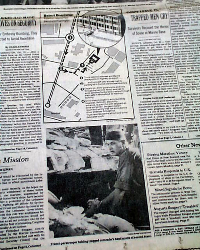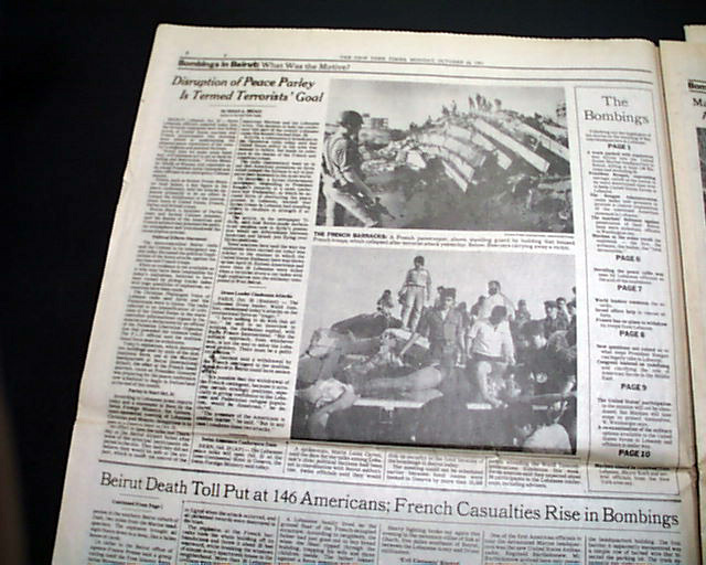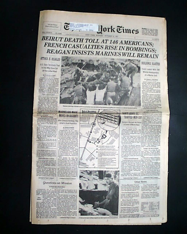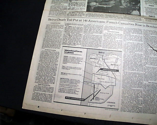 The front page has a nice banner headline: "BEIRUT DEATH TOLL AT 146 AMERICANS; FRENCH CASUALTIES RISE IN BOMBINGS; REAGAN INSISTS MARINES WILL REMAIN" with subheads, two related photos and diagram. (see images) Much more inside.