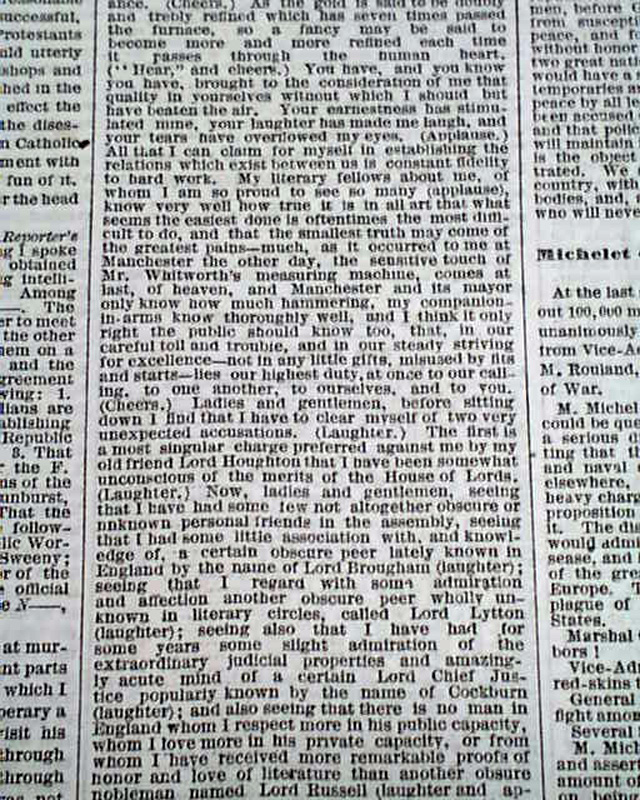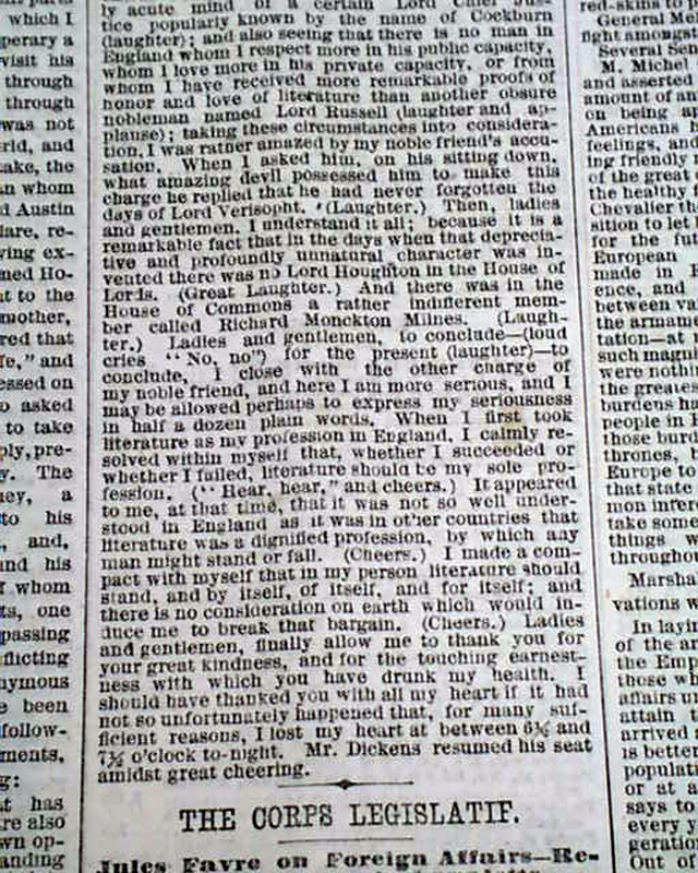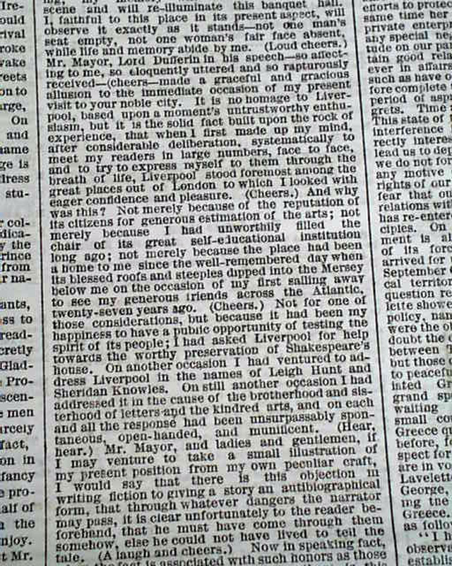 The front page has an article headed: "Charles Dickens" "Banquet in Liverpool--Mr. Hutchinson's Speech" (see images)