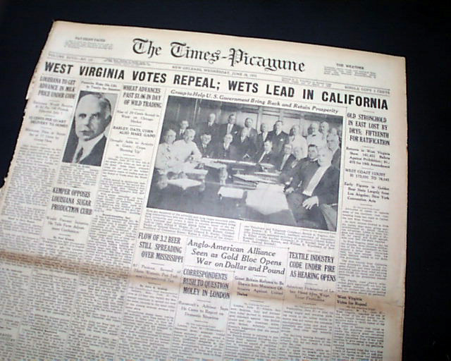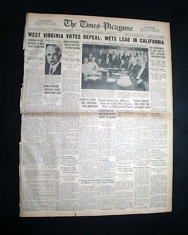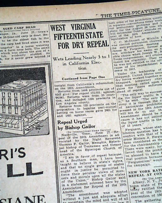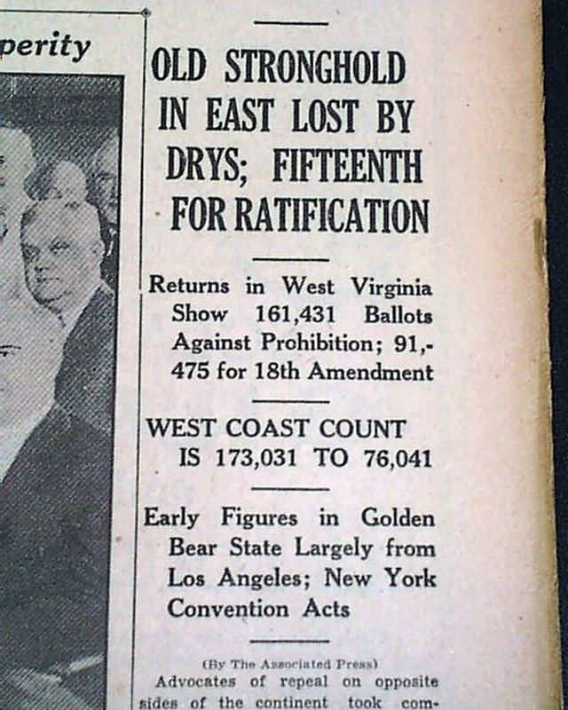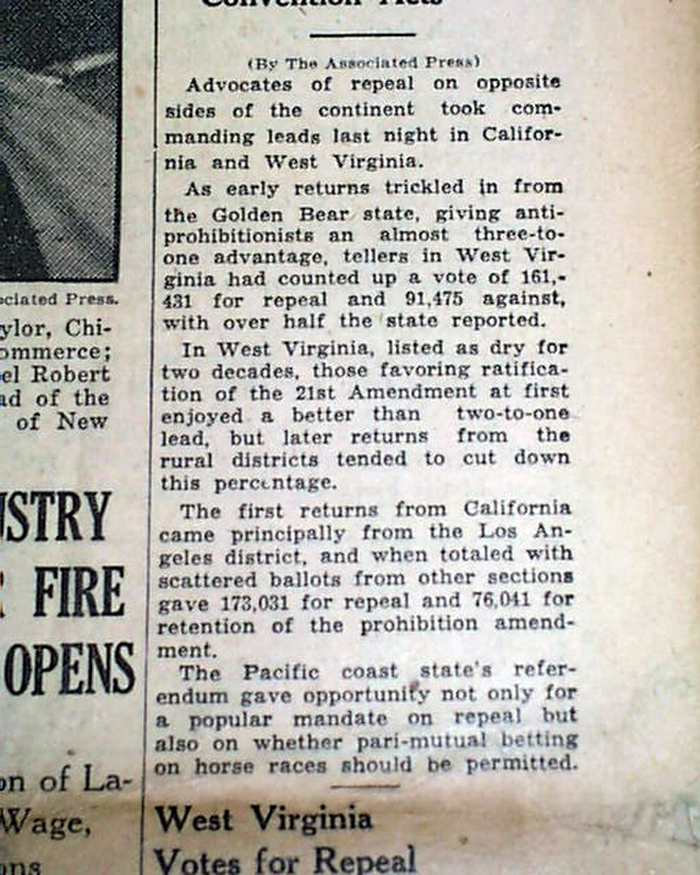 The front page has a banner headline: "WEST VIRGINIA VOTES REPEAL; WETS LEAD IN CALIFORNIA" with subheads. (see images) Related photo on the back page. (see images) First report coverage on the state of West Virginia ratifying the repeal of Prohibition in the United States.
