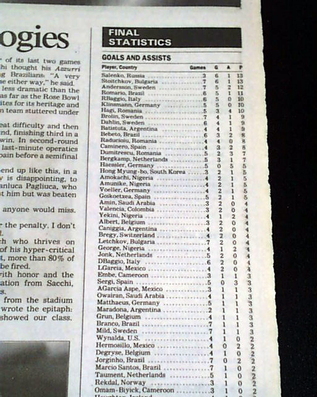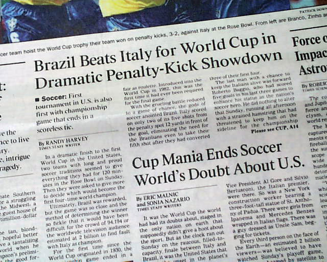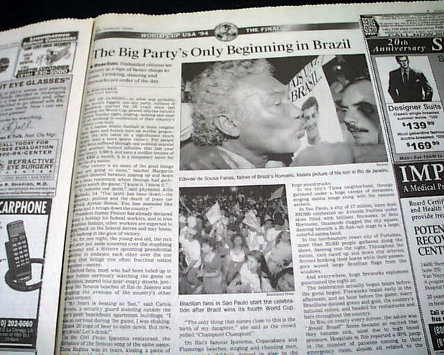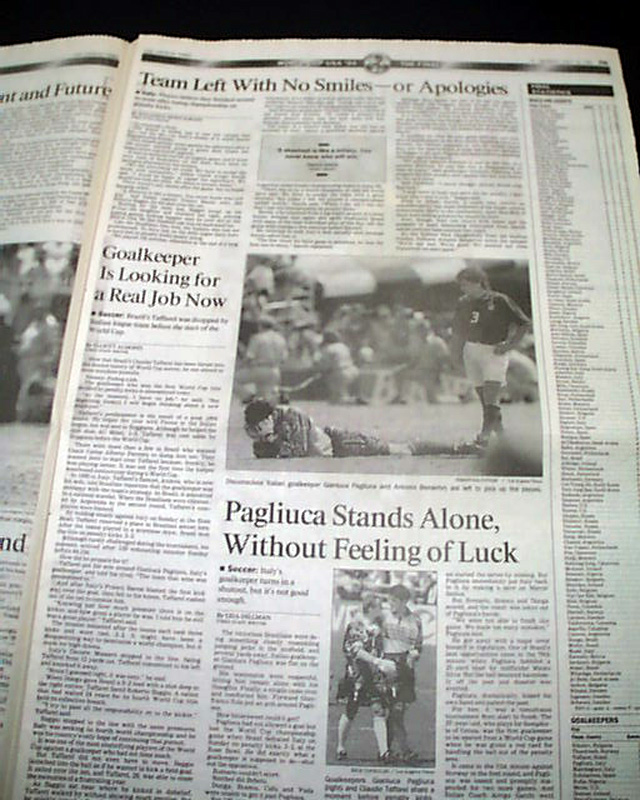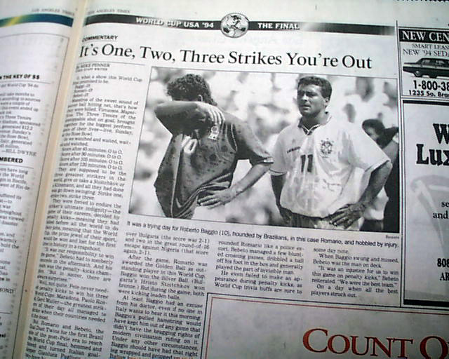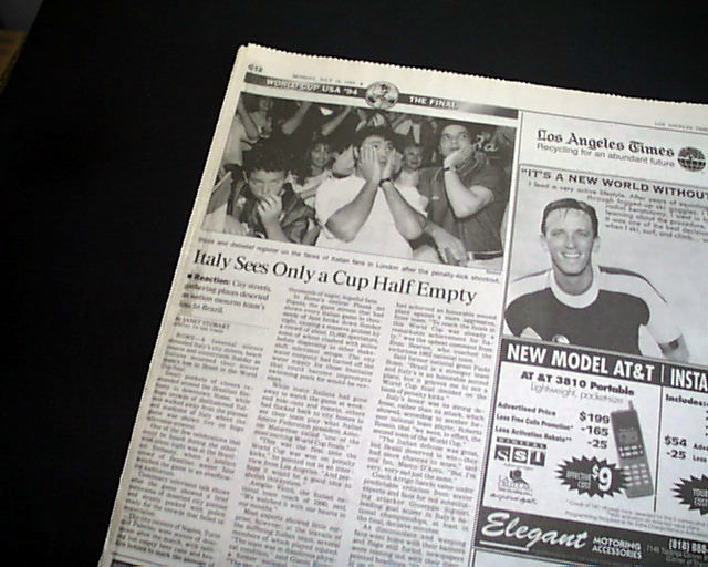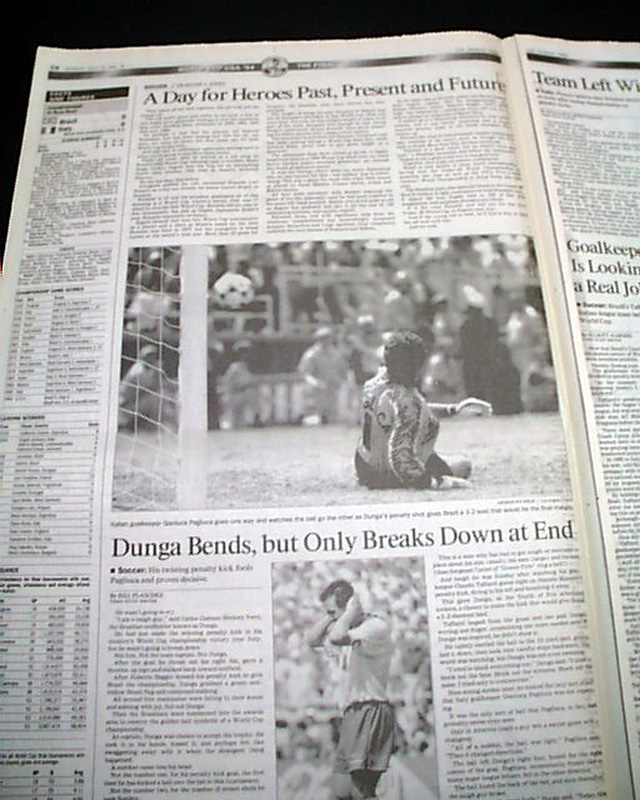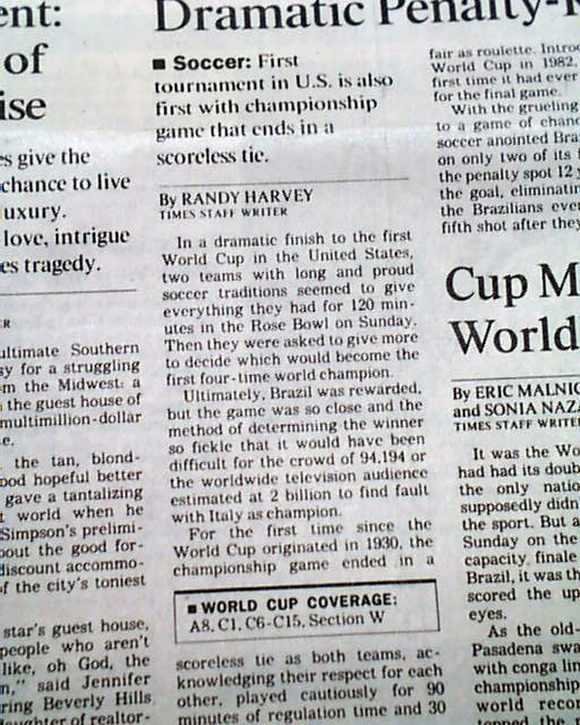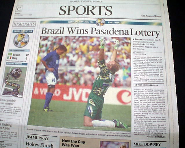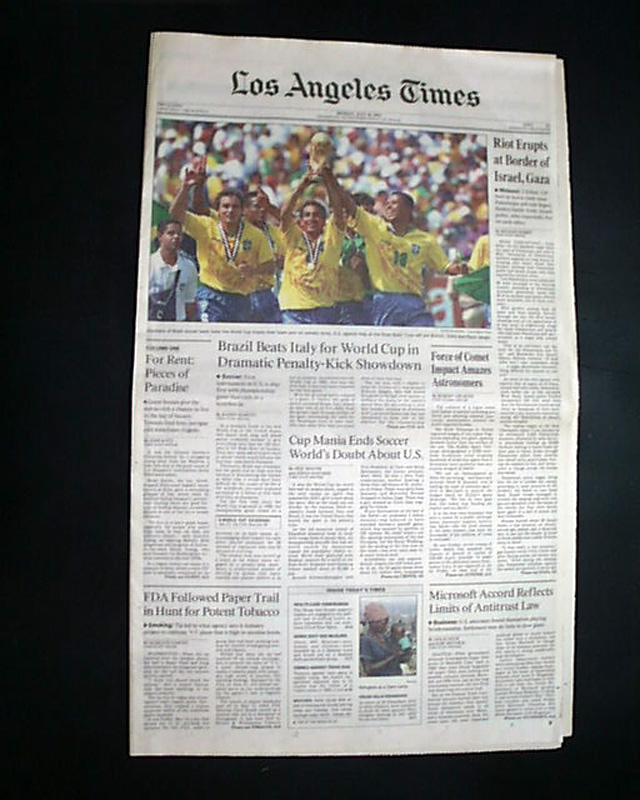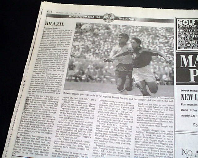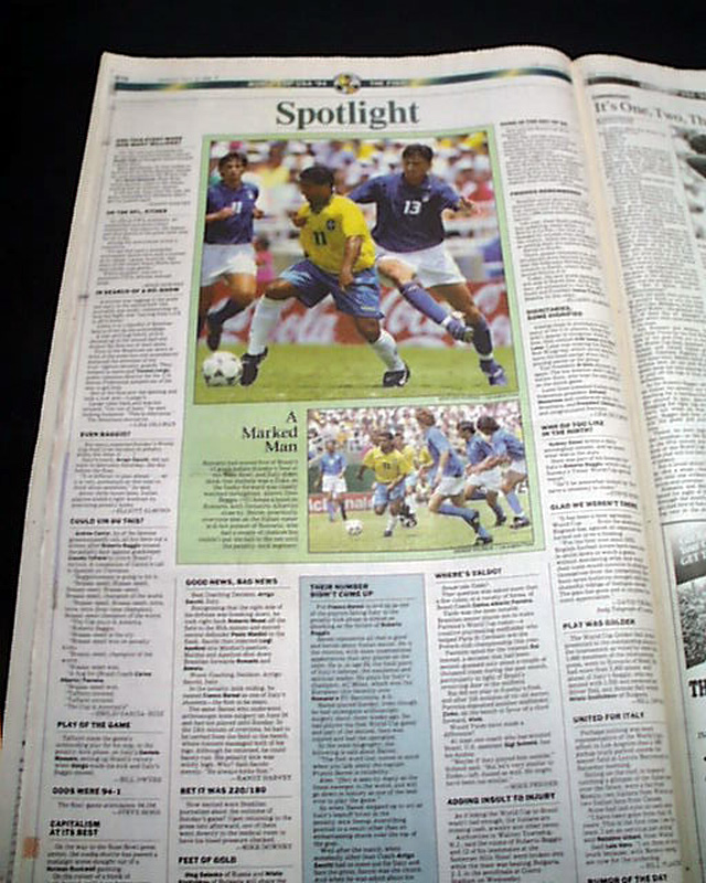 The front page has a three column headline: "Brazil Beats Italy for World Cup in Dramatic Penalty-Kick Showdown" with nice color photo. Much more in the sport's section, see images for portions. Nice to have in this publication as the final was played in the Rose Bowl.