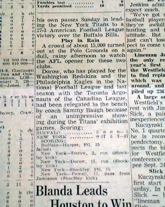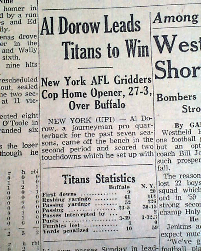 AI notes: On September 11, 1960, the Buffalo Bills played their first-ever regular-season game in the newly formed American Football League, facing the New York Titans at New York’s Polo Grounds. The Bills struggled offensively, managing only 113 total yards and a single field goal by Darrell Harper, which marked the first points in franchise history. Quarterbacks Bob Brodhead and Tommy O’Connell each threw interceptions, while the defense allowed 340 yards and 20 first downs, unable to contain the Titans’ balanced attack. New York quarterback Dick Jamieson threw for 152 yards and a touchdown, running back Al Dorow scored twice on the ground, and wide receiver Don Maynard had four catches for 116 yards, leading the Titans to a 27–3 victory. Despite the difficult debut, this game set the stage for the Bills’ inaugural AFL season, which concluded with a 5–8–1 record.