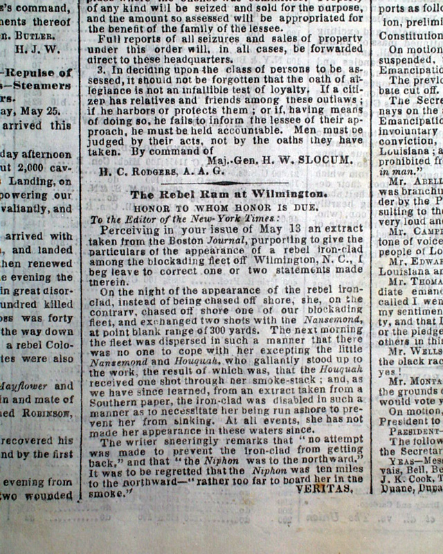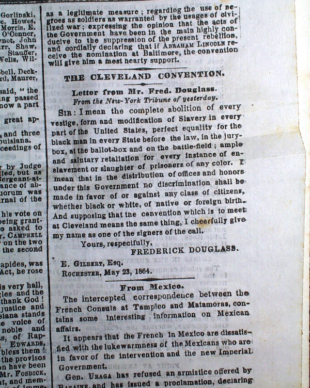 THE NEW YORK TRIMES, May 26, 1864  Although brief, the last column of the front page has a great item: "The Cleveland Convention--Letter from Mr. Fred. Douglass". The letter notes in part: "Sir: I mean the complete abolition of every vestige, form, and modification of Slavery in every part of the United States, perfect equality for the black man in every state before the law, in the jury-box, at the ballot box, and on the battle-field..." and more, signed in type: Frederick Douglass. See below for background.