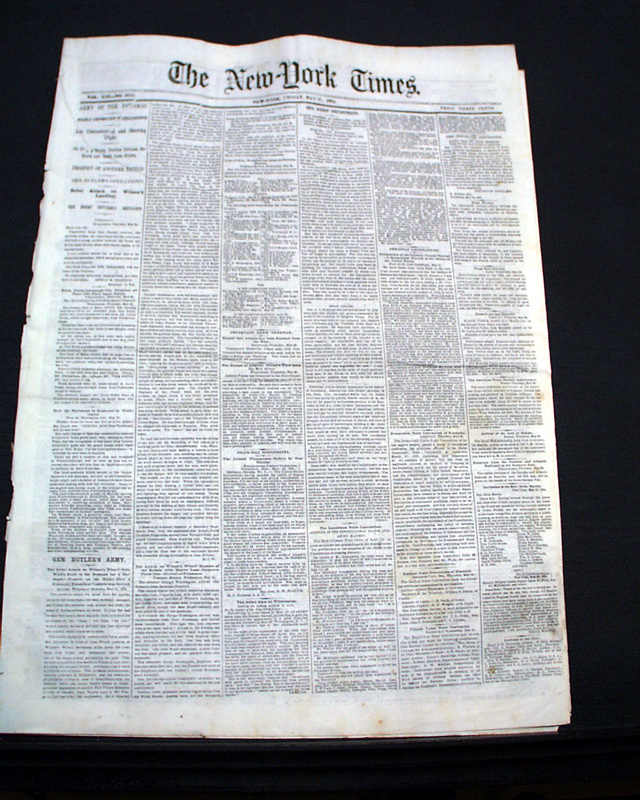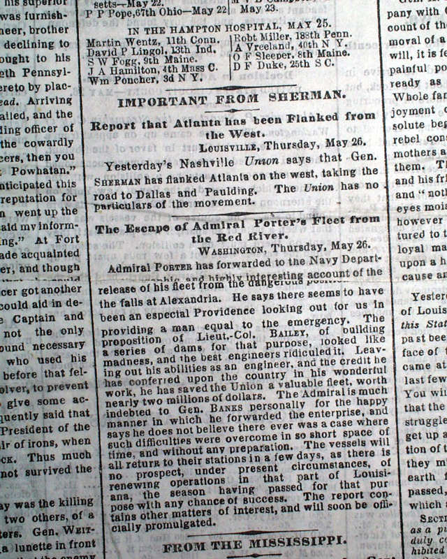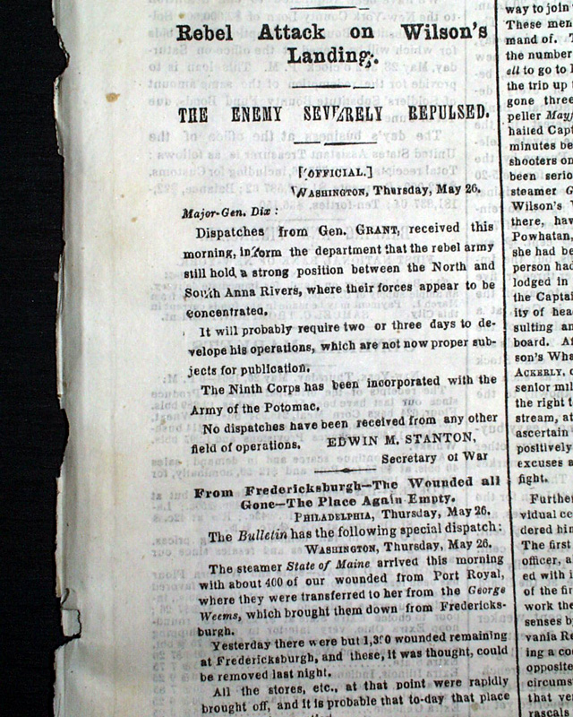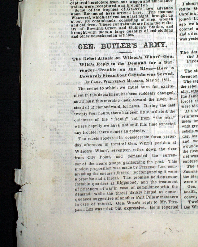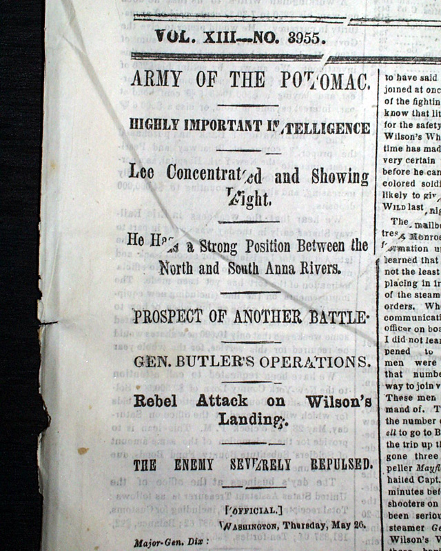 Also present on the front page are column heads on the Civil War: "Army of the Potomac", "Lee Concentrated and Showing Fight", "Rebel Attack on Wilson's Landing", and an update re: General Butler's Army. with more.
