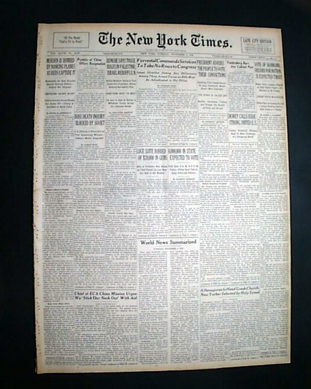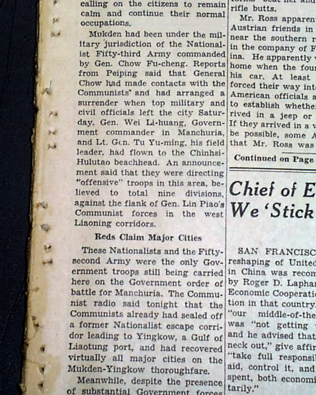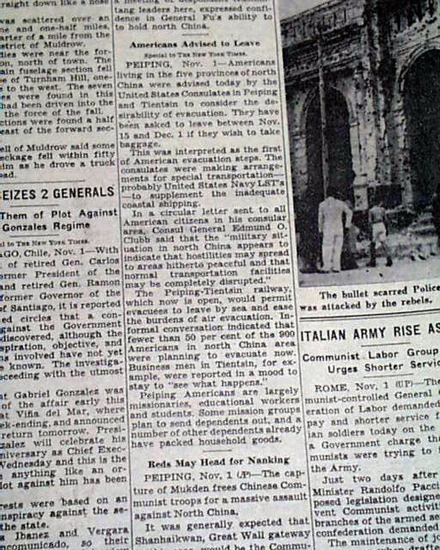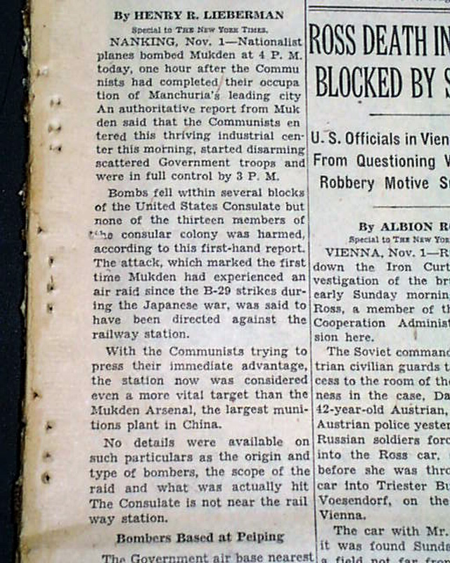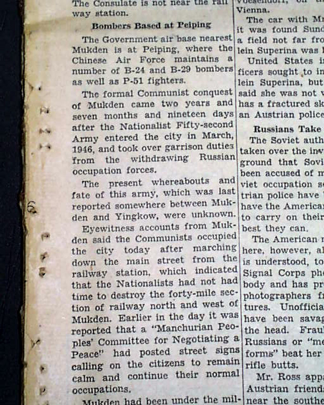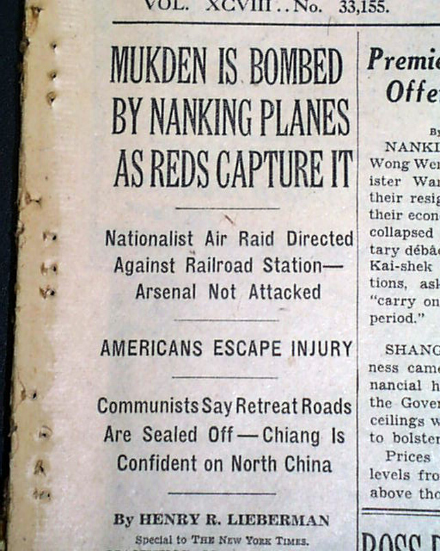 The top of the front page has a one column heading: "MUKDEN IS BOMBED BY NANKING PLANES AS REDS CAPTURE IT" with subheads. (see images)
