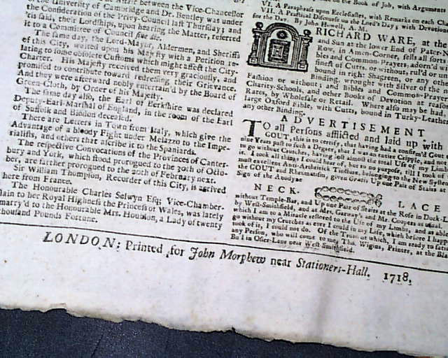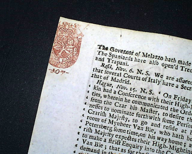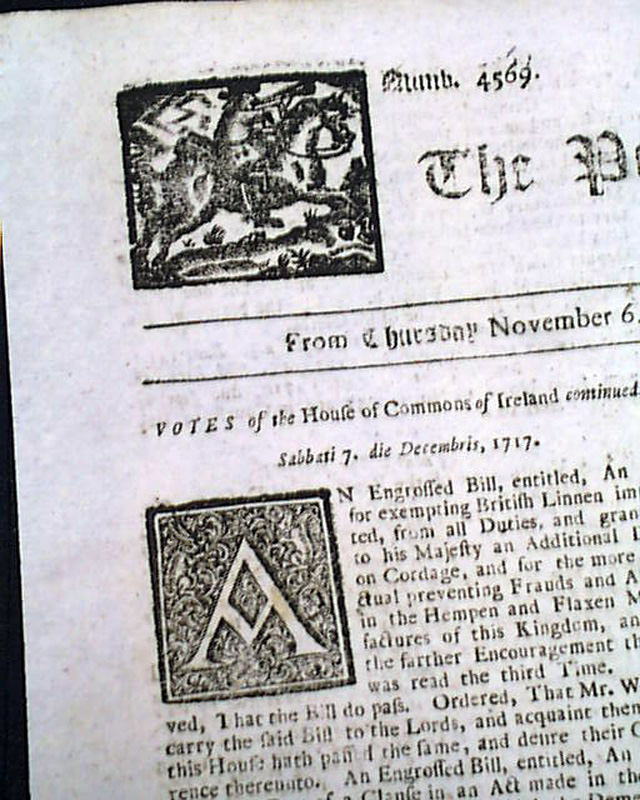 One of my favorite 18th century newspapers with the two nice engravings in the masthead, plus the very decorative first letter in the text (see). Various European reports.