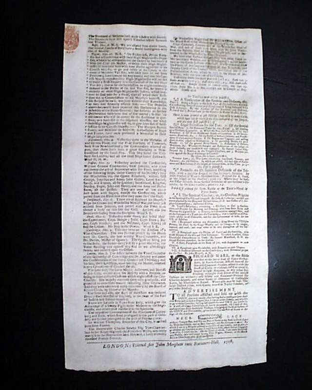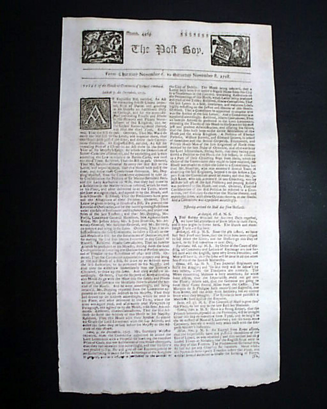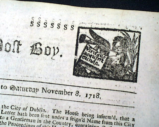 AI notes: The Post-Boy was a prominent London newspaper founded in 1695, emerging immediately after the lapse of the Licensing Act and continuing into the 1720s, and it is especially notable for its engraved masthead, a hallmark of early English journalism. The masthead typically featured a post-boy on horseback blowing a horn, sometimes accompanied by additional heraldic or allegorical figures, visually asserting the paper’s connection to the postal system and the rapid transmission of news at a time when information literally traveled by courier. Printed in a single-sheet format and issued several times a week, The Post-Boy carried domestic and foreign political news, court reports, commercial information, and advertisements, appealing to London’s growing literate public. Its woodcut engravings were not merely decorative but functioned as a brand identifier in an era of limited typography, helping readers quickly recognize the paper at stalls and coffeehouses. Along with titles such as The Flying Post, The Post-Boy exemplifies how early newspapers used masthead imagery to symbolize speed, reliability, and authority in news delivery, making it an important artifact in the visual and cultural history of the British press.