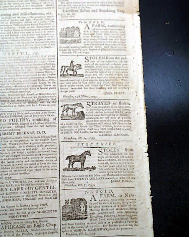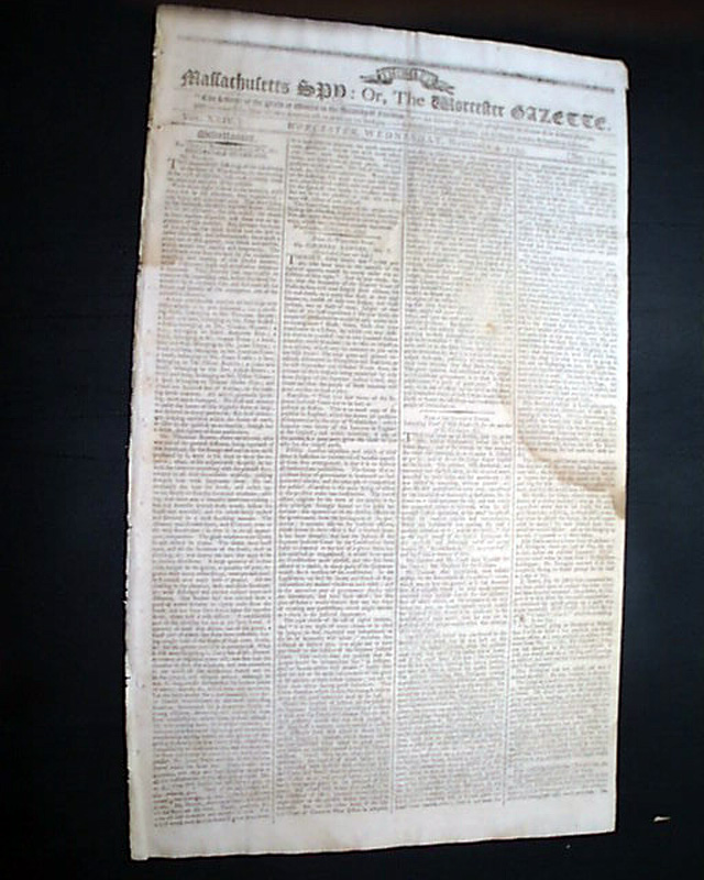 Published by Isaiah Thomas, perhaps the most famous printer of the 18th century, and whose collection became the foundation of the American Antiquarian Society. Handsome masthead makes this a displayable newspaper.