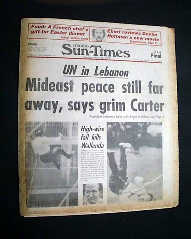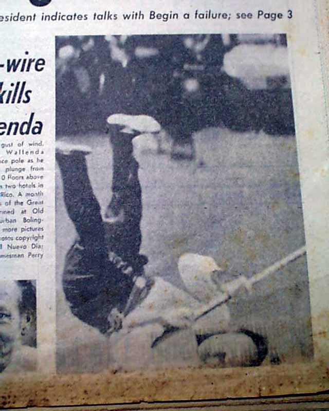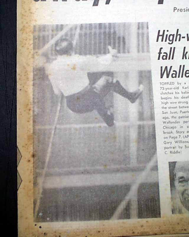 The front page has two graphic photos showing Karl Wallenda falling to his death with one column heading: "High-wire fall kills Wallenda"