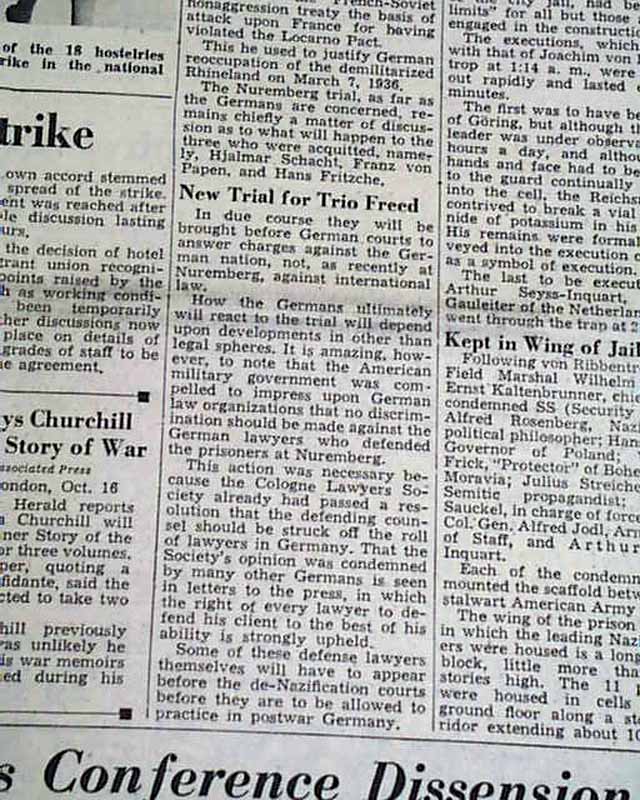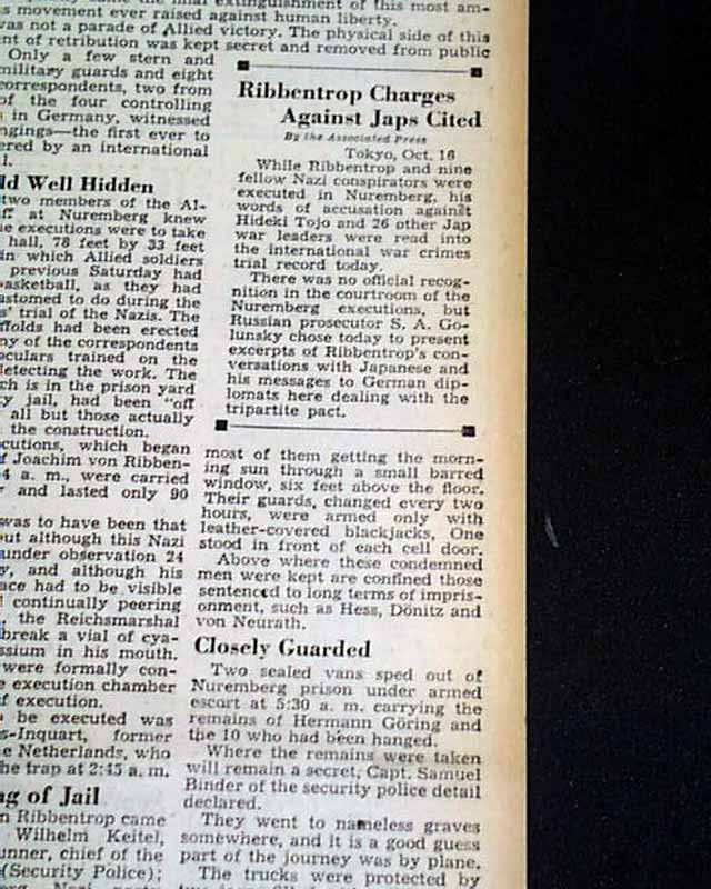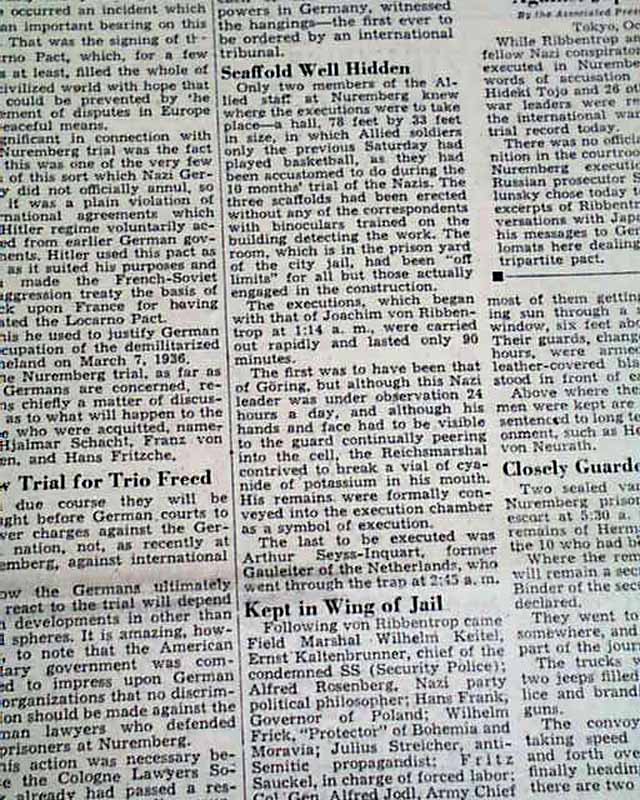 AI notes: On October 16, 1946, the aftermath of the Nuremberg Trials reached its final, grim conclusion. Hermann Göring, the highest-ranking Nazi leader on trial and designated successor to Hitler, committed suicide by ingesting cyanide just hours before his scheduled execution. Göring’s suicide shocked the Allied authorities and marked a dramatic end to one of the most prominent Nazi figures. Later that day, ten other leading Nazis, including Rudolf Hess, Joachim von Ribbentrop, Wilhelm Keitel, Ernst Kaltenbrunner, Alfred Rosenberg, Hans Frank, Wilhelm Frick, Julius Streicher, Fritz Sauckel, and Arthur Seyss-Inquart, were hanged in Nuremberg. Their executions were carried out under Allied supervision in accordance with the sentences handed down by the International Military Tribunal for crimes against peace, war crimes, and crimes against humanity. The hangings were a historic moment, symbolizing the Allies’ effort to bring Nazi leaders to justice and setting a precedent for international law.