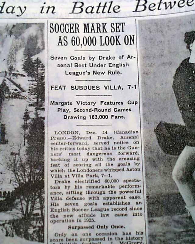 AI notes: The 1935–36 season First Division match between Aston Villa and Arsenal at Villa Park took place on 14 December 1935. Arsenal won the fixture 7–1 with all of their seven goals scored by striker Ted Drake, a record haul for a top flight fixture, and a record for any division at the time. The top-flight record still stands today and is all the more notable due to Drake being on the away team and also carrying a knee injury at the time.