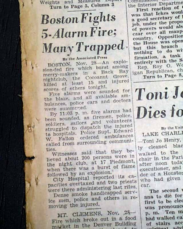 The front page has a very early and somewhat discrete report with one column heading: "Boston Fights 5-Alarm Fire; Many Trapped" (see image) Notice how the report claims only 15 were confirmed dead at the time of this publication with printed.