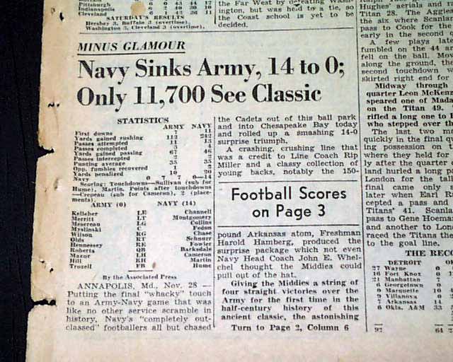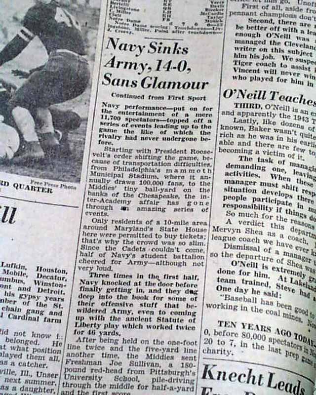 AI notes: The November 29, 1942 Army-Navy football game in Annapolis was much more than just a contest between two college football teams—it was a reflection of the broader national mood during World War II, where the stakes of the game symbolized the deep sense of patriotism and sacrifice of the time. Played in the midst of the war, with many of the athletes already enlisted or soon to be drafted into military service, the rivalry between Army and Navy had heightened significance. The game took place at Navy-Marine Corps Memorial Stadium in Annapolis, home of the U.S. Naval Academy, and was charged with the tension of a country at war. Army, led by future Heisman winner Doc Blanchard, was a heavy favorite, and their powerful running game, which would dominate the game in cold and gusty conditions, secured a 14-0 victory over Navy. However, the true significance lay in the players themselves—these future officers were already preparing to leave the football field for the frontlines, and their athleticism was a symbol of the country’s resilience and resolve. The game underscored the intertwining of sports and military duty, with both teams embodying the fighting spirit of their respective branches, and the victory for Army further fueled the sense of national pride. In a time when Americans were facing the global conflict head-on, the Army-Navy game was a rare and cherished moment of unity, pride, and hope, as it celebrated not just the rivalry but the broader purpose of defending the nation.