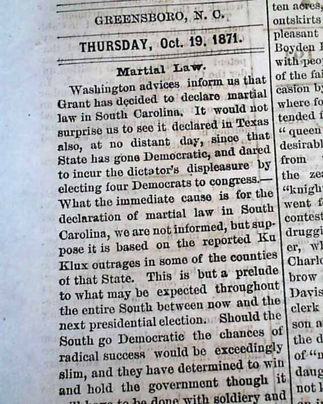 AI notes: In October 1871, President Ulysses S. Grant took decisive action against the Ku Klux Klan in South Carolina by declaring martial law in several counties plagued by widespread violence and intimidation aimed at suppressing Black political participation. This move was authorized under the Enforcement Acts of 1870–1871, federal laws designed to protect the civil and political rights of African Americans and to empower the federal government to intervene when states failed to stop racial terrorism. Under martial law, Grant deployed federal troops, authorized the arrest and prosecution of Klan members, and, in some areas, temporarily suspended habeas corpus to restore order. These measures resulted in the arrest of hundreds of Klan members and the dismantling of much of the organization’s local power, demonstrating one of the most forceful uses of federal authority during the Reconstruction era to uphold civil rights and combat violent white supremacist activity.