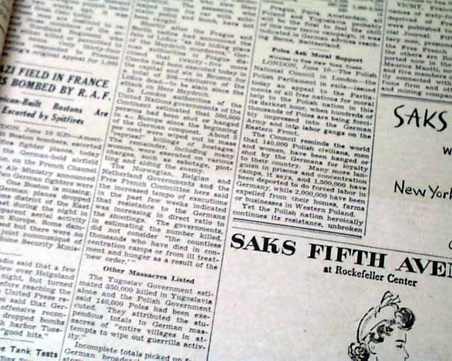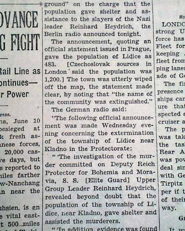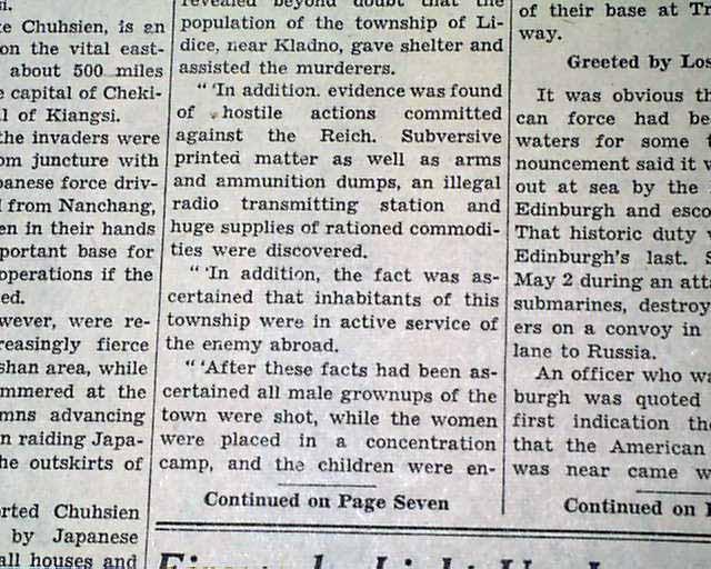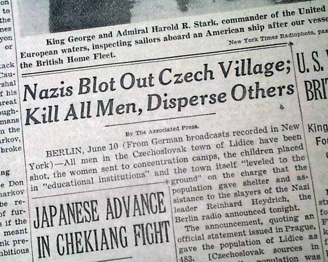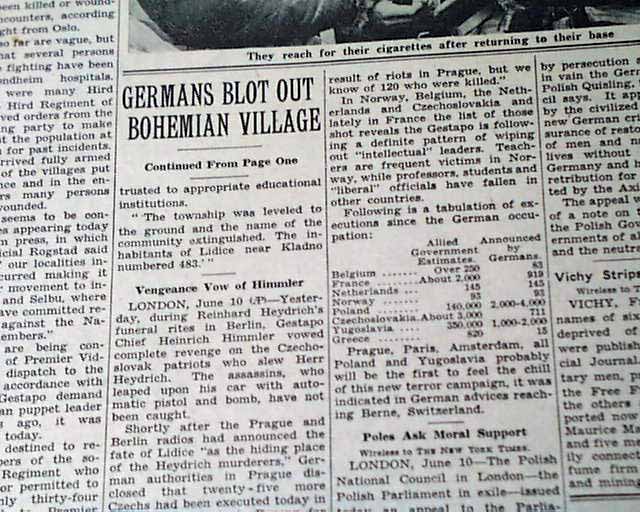 The front page has a two column heading: "Nazis Blot Out Czech Village; Kill All Men, Disperse Others" (see images)
