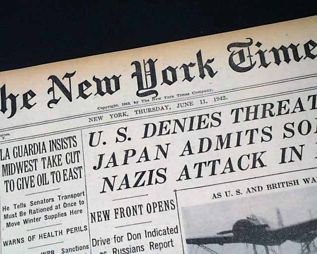 Other news, sports and advertisements of the day with much on World war II including coverage on the recent victory at the Battle of Midway. Complete with all 44 pages, light toning at the margins, nice condition.