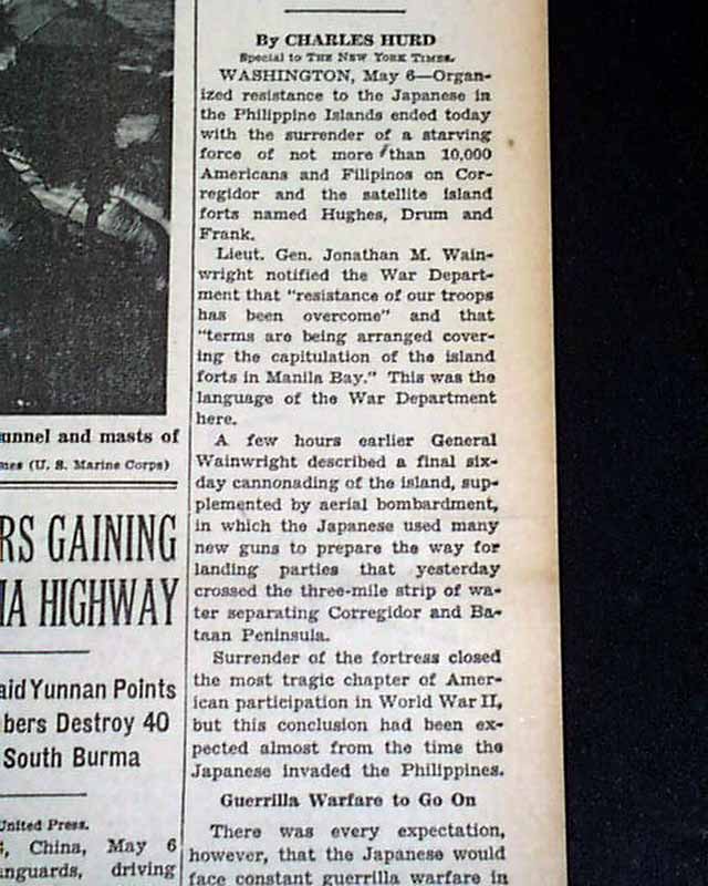 AI notes: On May 6, 1942, after months of intense fighting and dwindling supplies, the last organized resistance of American and Filipino forces in the Philippines came to an end with the Surrender of Corregidor to the Japanese. Corregidor, a heavily fortified island at the entrance of Manila Bay, had been the final stronghold for the U.S. and Filipino troops after the fall of the Bataan Peninsula in April. Despite stubborn resistance and a valiant defense led by General Jonathan M. Wainwright, the island was surrounded, bombarded relentlessly, and cut off from reinforcements. The defenders faced severe shortages of food, medicine, and ammunition, and after a final, desperate effort to hold out, Wainwright was forced to surrender to the Japanese forces. This marked the culmination of the Japanese conquest of the Philippines, a crucial strategic blow to the Allied forces in the Pacific. The surrender of Corregidor also led to the capture of thousands of prisoners who were subjected to the brutal Bataan Death March. Though it was a dark moment for the Allies, the fall of Corregidor was not the end of the Philippines campaign, as General Douglas MacArthur would later return to fulfill his famous promise to the Filipino people, "I shall return," with the eventual liberation of the islands in 1944.