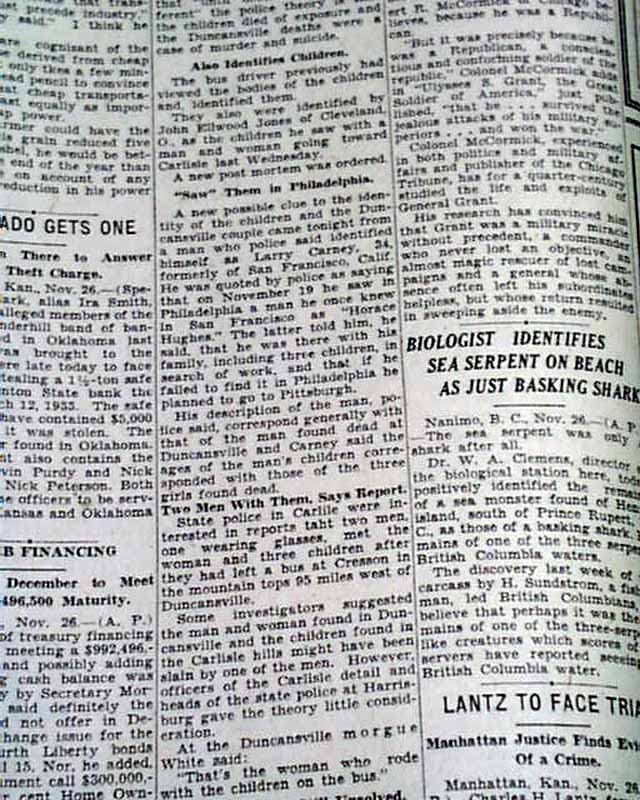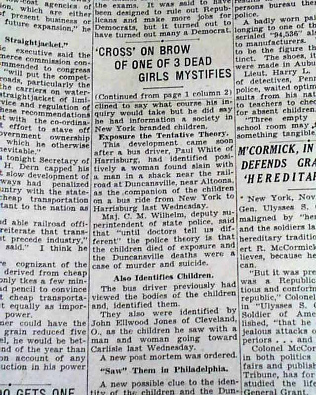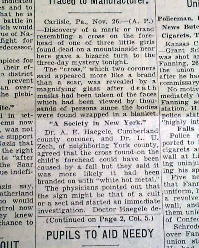 The front page has a one column heading: "'CROSS' ON BROW OF ONE OF 3 DEAD GIRLS MYSTIFIES" with subheads. (see images) Also there is a rare three column photo showing the girls laying on the blanket in the woods. I covered up this image for discretion purposes. If you want to see this obvious objectionable image, you may contact us and we will send it to you privately.