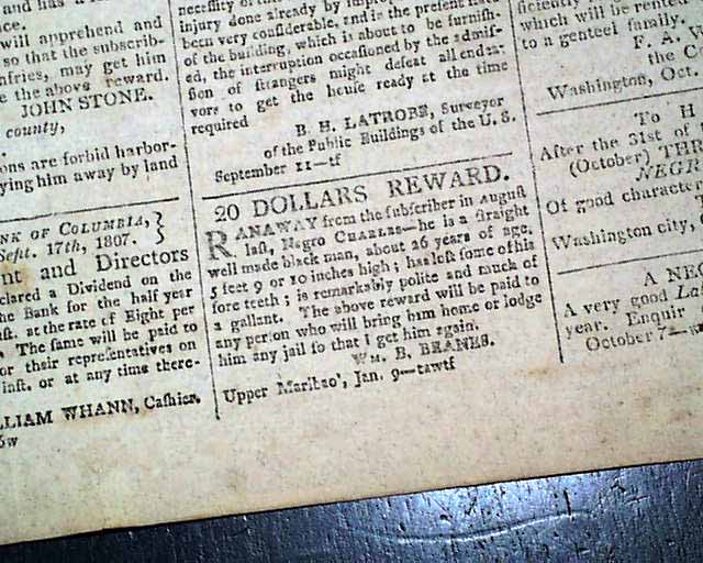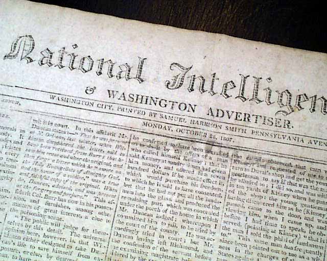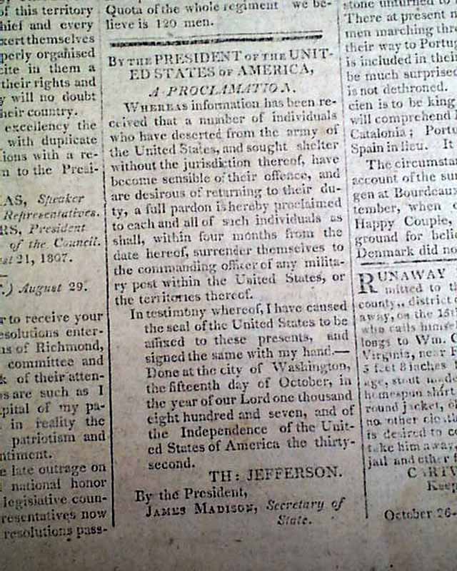 NATIONAL INTELLIGENCER, & DWASHINGTON ADVERITSER, D.C., Oct. 26, 1807 Page 3 has: "A Proclamation" by the President concerning those: "...who have deserted from the army of the United States...has become sensible of their offense & are desirous of returning to their duty, a full pardon is hereby proclaimed...as shall, within four months...surrender themselves to the commanding officer..." signed in type: Th. Jefferson.