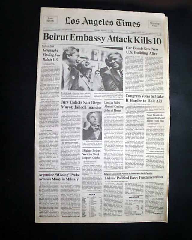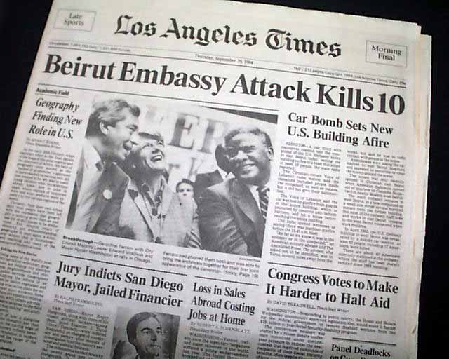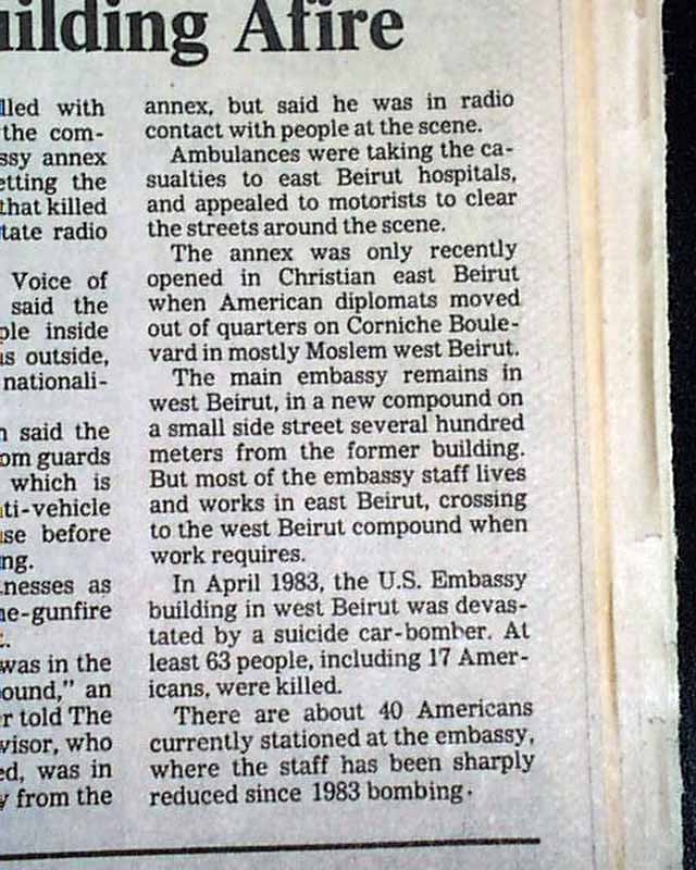 The top of the front page has a banner headline: "Beirut Embassy Attack Kills 10" with subhead. (see images) This a early, same report as the number of dead would ultimately be 24.