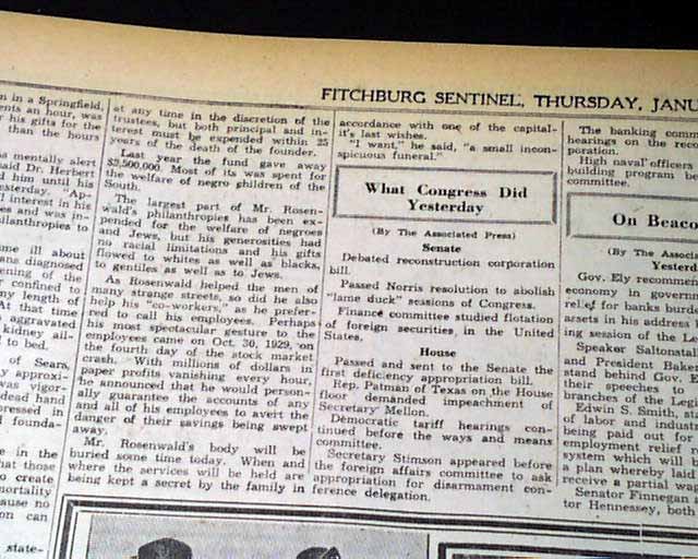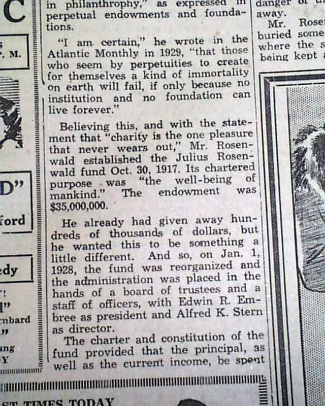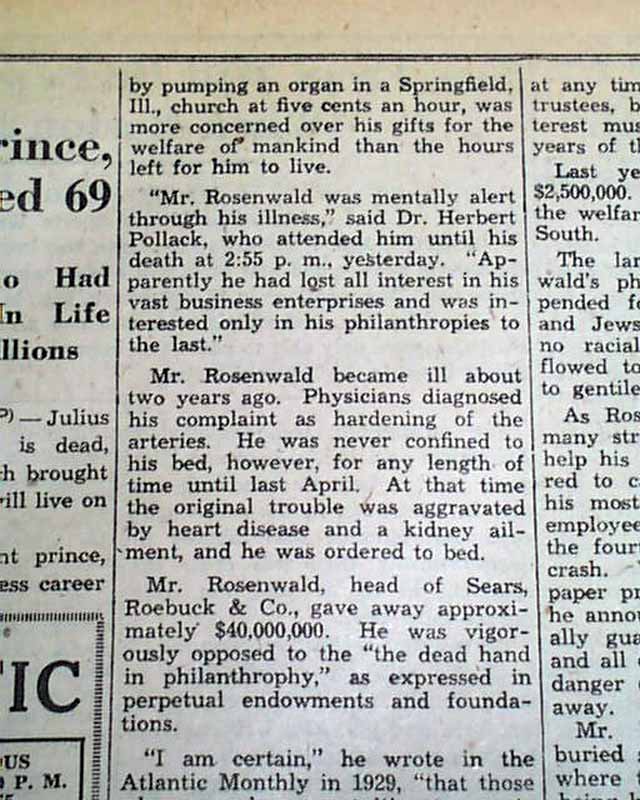 The top of page 7 has a one column heading : "Rosenwald, Merchant Prince, Dies, Aged 69" with subhead. (see images)
