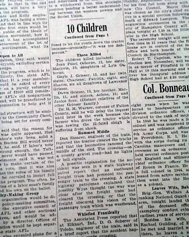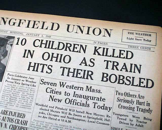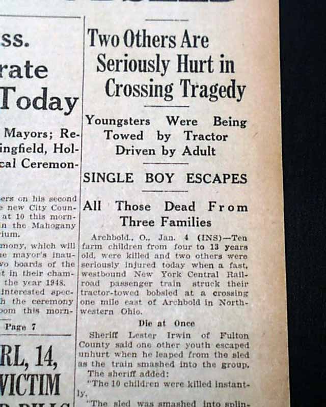 The top of the front page has a four column headline: "10 CHILDREN KILLED IN OHIO AS TRAIN HITS THEIR BOBSLED" with subheads. (see images)