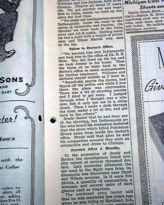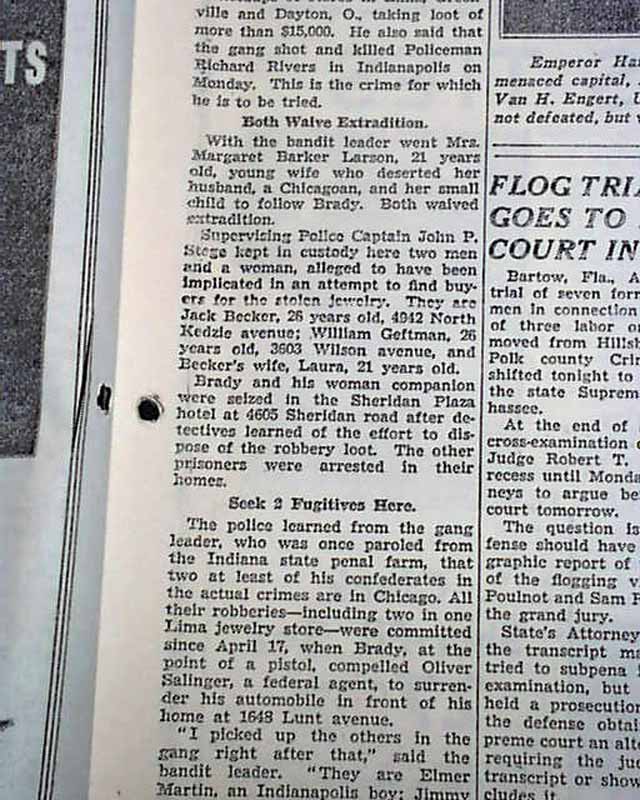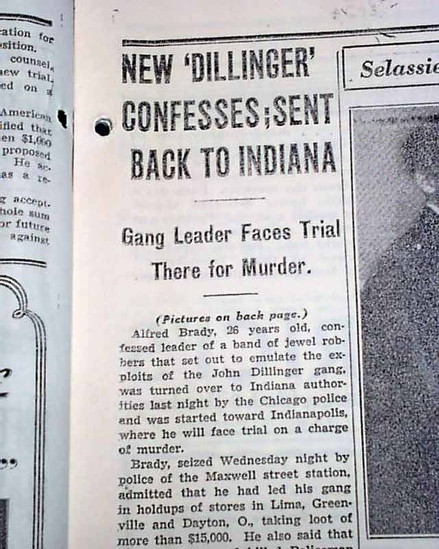 The top of page 3 has a one column heading: "NEW 'DILLINGER' CONFESSES; SENT BACK TO INDIANA" with subhead. (see images) Two related photos are on the back page. This was about 1 1/2 years prior to their infamous shootout with F.B.I. agents in Bangor, Maine.