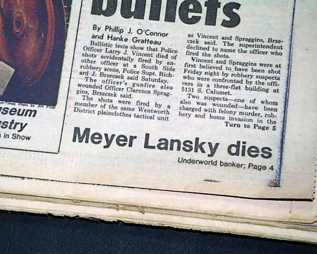 The bottom of the front page has a small heading: "Meyer Lansky dies"