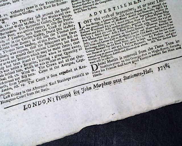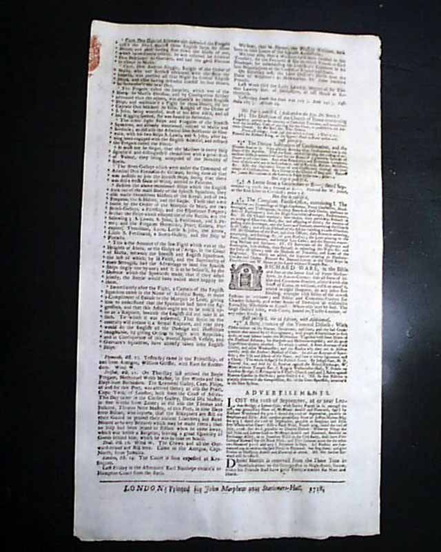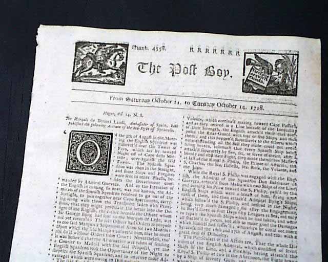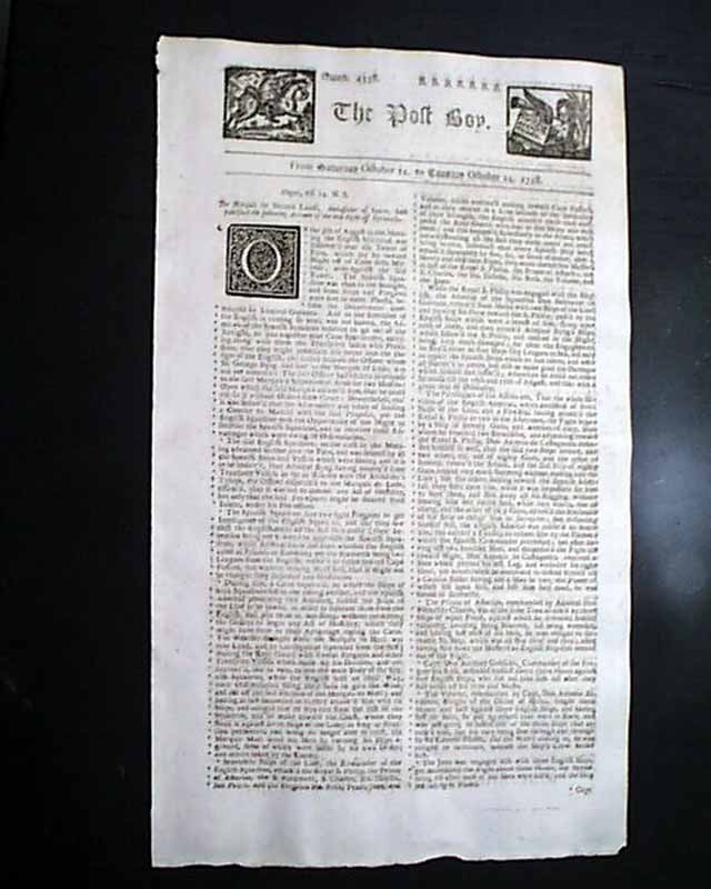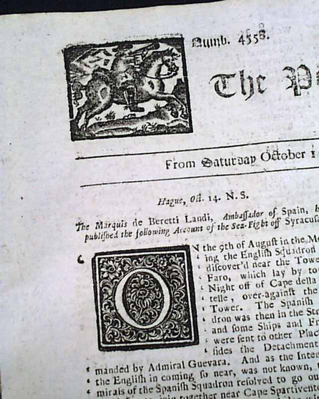 One of my favorite 18th century newspapers with the two nice engravings in the masthead, plus the very decorative first letter in the text (see). Various European reports.