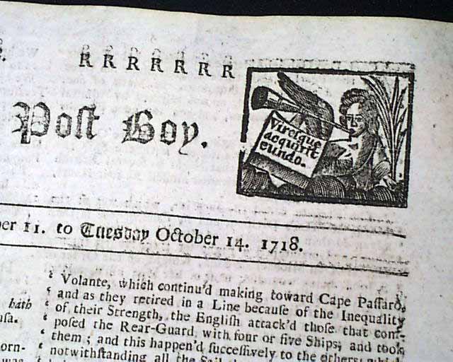 AI notes: The Post-Boy was a prominent London newspaper founded in 1695, emerging immediately after the lapse of the Licensing Act and continuing into the 1720s, and it is especially notable for its engraved masthead, a hallmark of early English journalism. The masthead typically featured a post-boy on horseback blowing a horn, sometimes accompanied by additional heraldic or allegorical figures, visually asserting the paper’s connection to the postal system and the rapid transmission of news at a time when information literally traveled by courier. Printed in a single-sheet format and issued several times a week, The Post-Boy carried domestic and foreign political news, court reports, commercial information, and advertisements, appealing to London’s growing literate public. Its woodcut engravings were not merely decorative but functioned as a brand identifier in an era of limited typography, helping readers quickly recognize the paper at stalls and coffeehouses. Along with titles such as The Flying Post, The Post-Boy exemplifies how early newspapers used masthead imagery to symbolize speed, reliability, and authority in news delivery, making it an important artifact in the visual and cultural history of the British press.