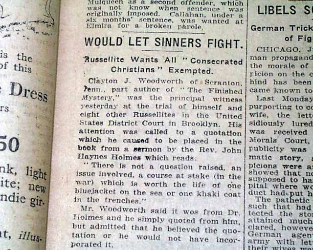 AI notes: The trial of Clayton J. Woodworth, a leading official of the Watch Tower Bible & Tract Society and a prominent so-called Russellite, took place in June 1918 in the U.S. District Court for the Eastern District of New York, Brooklyn, amid the heightened wartime repression of dissent during World War I. Woodworth was tried alongside several other Society leaders, including President Joseph F. Rutherford, under the Espionage Act of 1917 and related statutes, with federal prosecutors arguing that their writings—especially the recently published volume The Finished Mystery—contained language hostile to militarism and the war effort and thus encouraged draft resistance and disloyalty among soldiers and civilians. The government introduced passages from the book, correspondence, and internal organizational materials as evidence, asserting that the defendants’ religious teachings undermined national unity during wartime. After a closely watched and controversial proceeding, the jury returned guilty verdicts in mid-June 1918, and Woodworth was sentenced to a lengthy federal prison term (commonly reported as part of a 20-year sentence imposed on the defendants). Although the convictions initially stood and the men were incarcerated, the case later became emblematic of wartime overreach: the convictions were overturned on appeal after the war, and Woodworth was released, with historians now viewing the trial as a significant episode in the history of civil liberties and religious freedom in the United States.