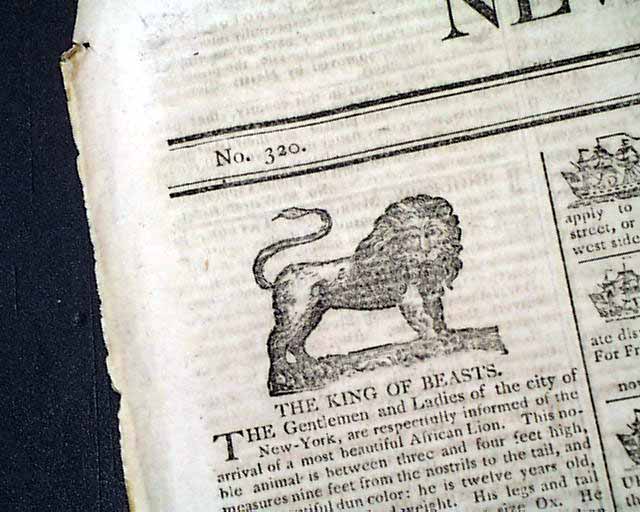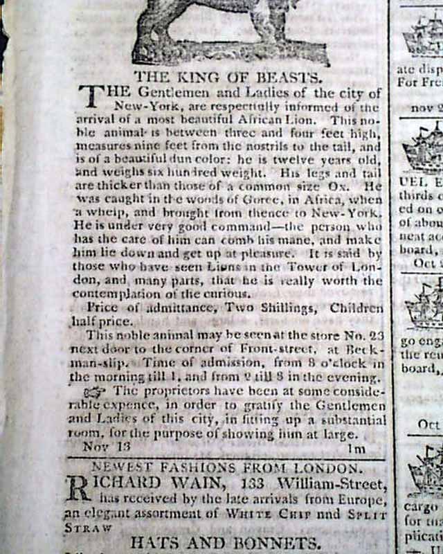 The top of the front page has a notice for an exhibit of "The King Of Beasts" which includes details about the event and a woodcut of the African lion. Complete with all 4 pages, minor margin wear, nice condition.