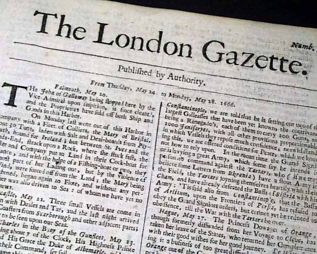 A very early issue of this famous newspaper, the oldest continually published English language in the world. It began one year prior in 1665 and still exists today.