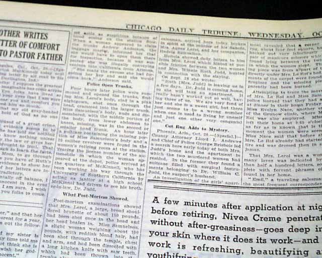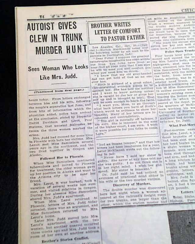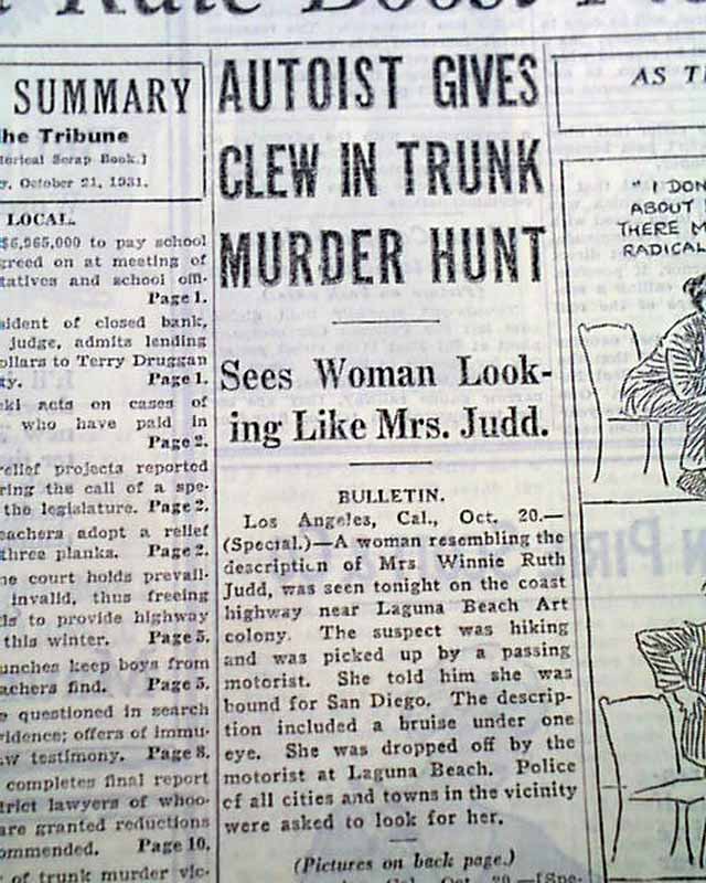 The front page has a one column heading: "AUTOIST GIVES CLEW IN TRUNK MURDER HUNT" with subhead. (see images)