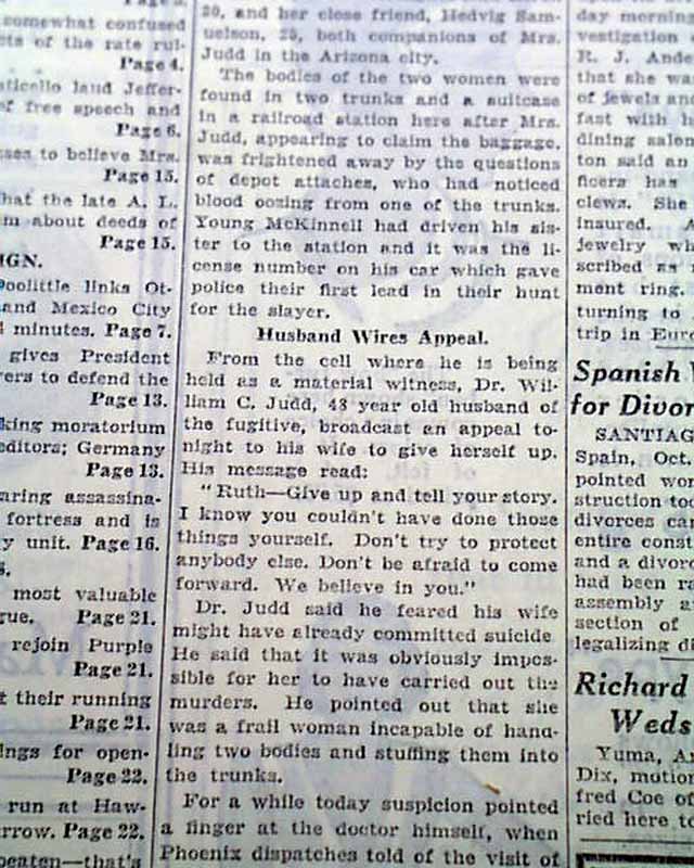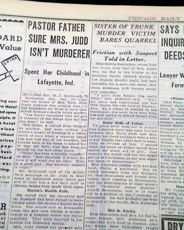 AI notes: Winnie Ruth Judd, often mistakenly called Ruth Judd, was at the center of one of the most notorious “trunk murder” cases of 1931 in the United States. In October 1931, in Phoenix, Arizona, Judd killed her two friends and romantic rivals, Agnes Anne LeRoi and Hedvig Samuelson, during an argument at her bungalow, shooting both women and then dismembering their bodies. She packed the remains into steamer trunks and attempted to ship them by train to Los Angeles, but leaking fluids and a foul odor led railroad employees to open the trunks at the station, revealing the gruesome crime. Judd was arrested, tried, and convicted of first-degree murder, becoming a national media sensation as newspapers sensationalized the case with lurid headlines, courtroom sketches, and the enduring nickname “The Trunk Murderess.” Though sentenced to death, her punishment was later commuted after she was declared insane; she spent decades in mental institutions before being paroled in the early 1970s, making the case one of the most infamous crime stories of Depression-era America.