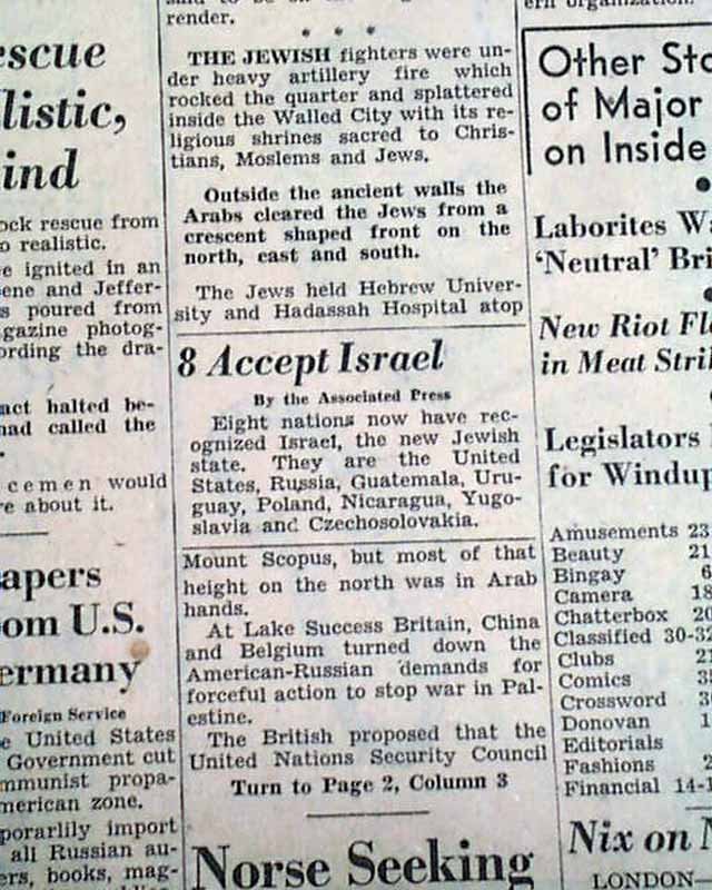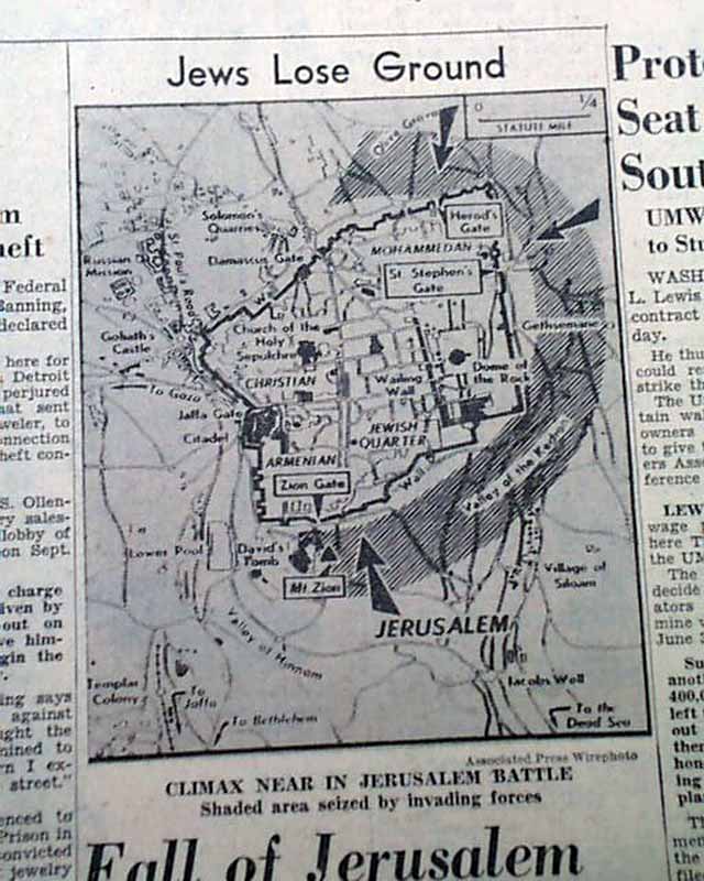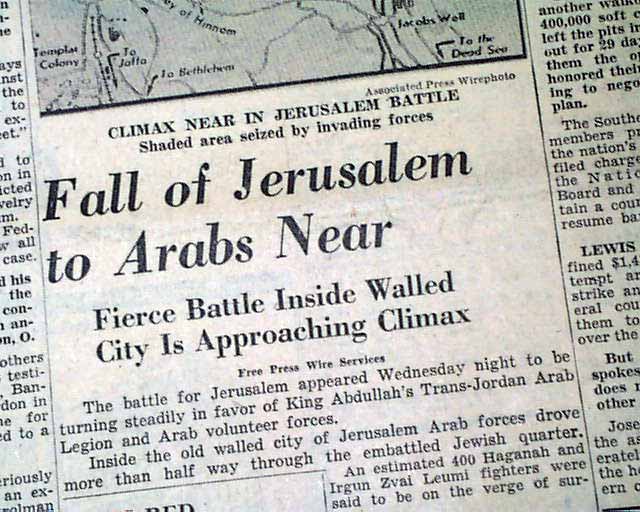 The front has a two column heading: "Fall of Jerusalem to Arabs Near" with subhead and related map. (see images)