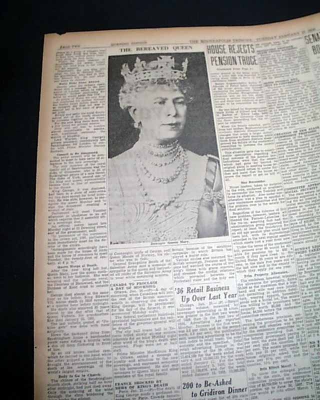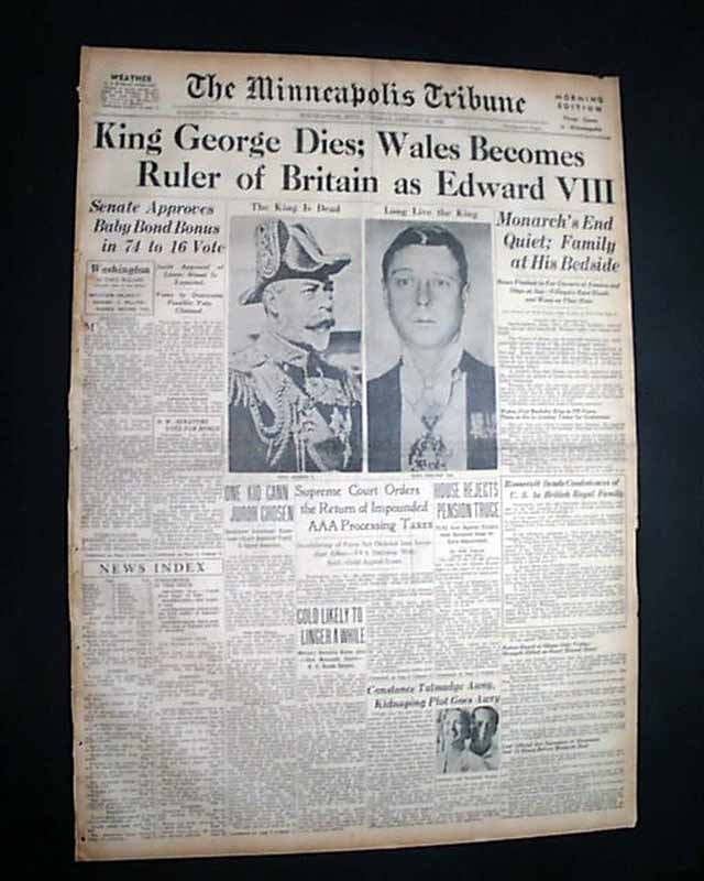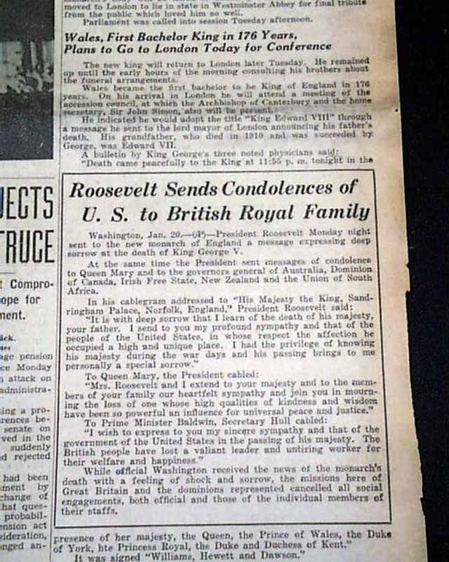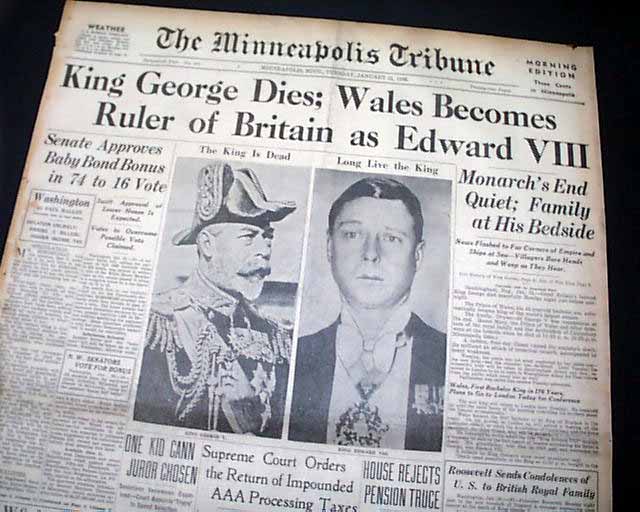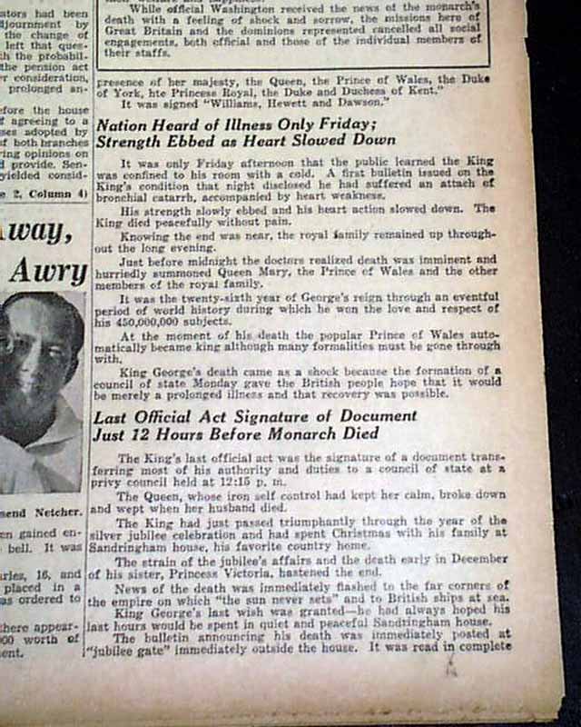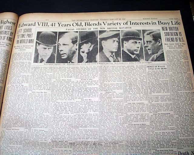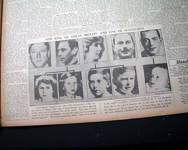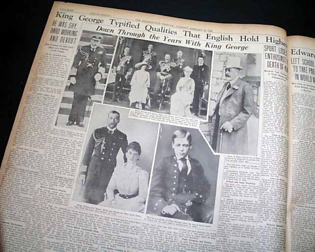 The banner headline announces: "King George Dies; Wales Becomes Ruler of Britain as Edward VIII" with subheads and two related photos. (see images) Nice for display. More inside.
