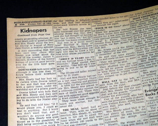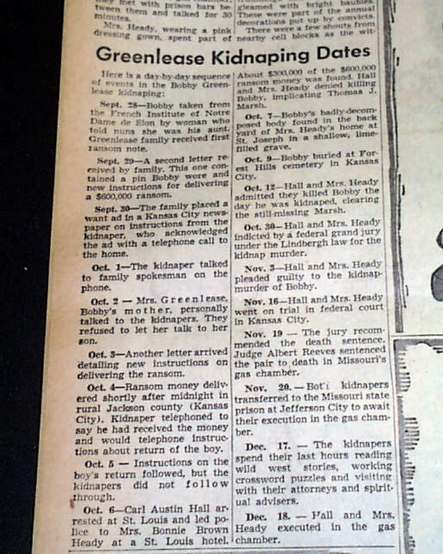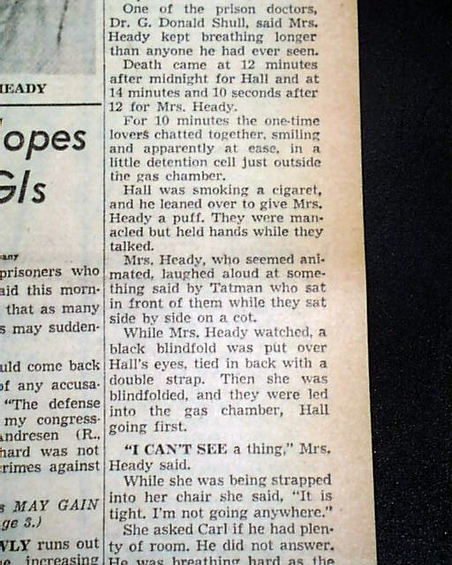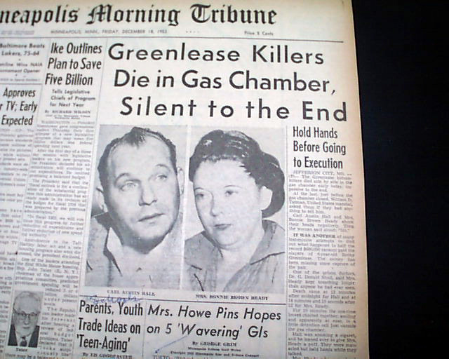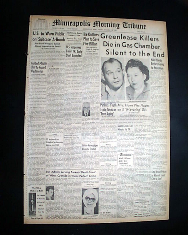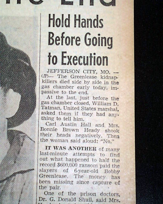 The top of the front page is a four column headline: "Greenlease Killers Die in Gas Chamber, Silent to the End" with subhead and photos. (see images)