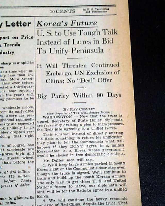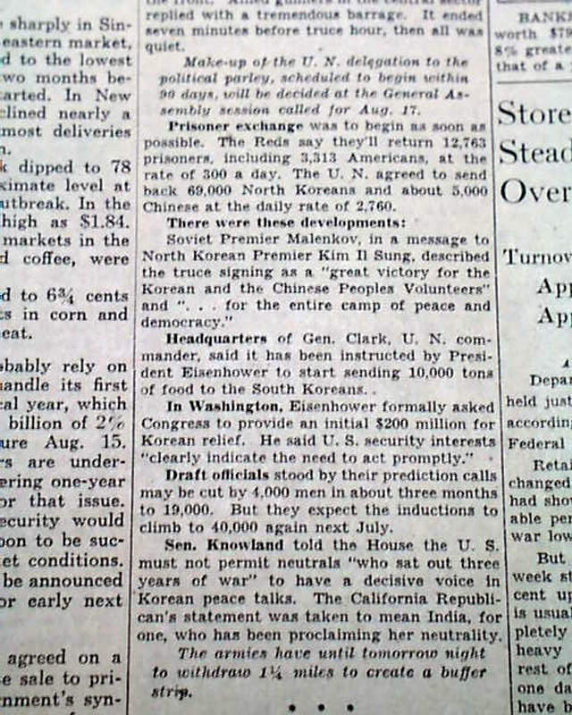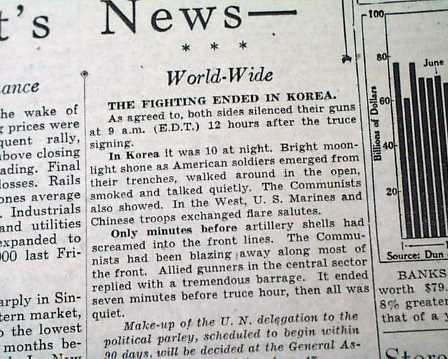 Although this publication is known for it's financial news of the day, this issue has a very small heading on the front page: "The Fighting Ended In Korea" and more. (see images)