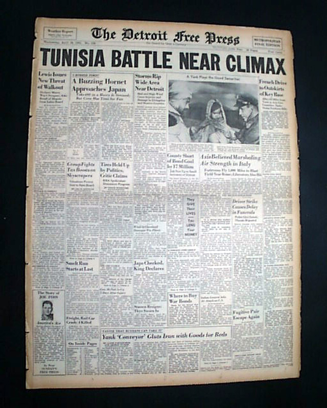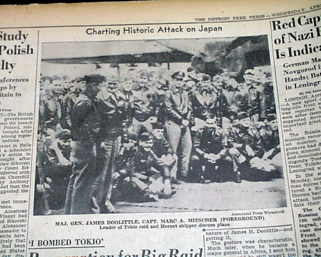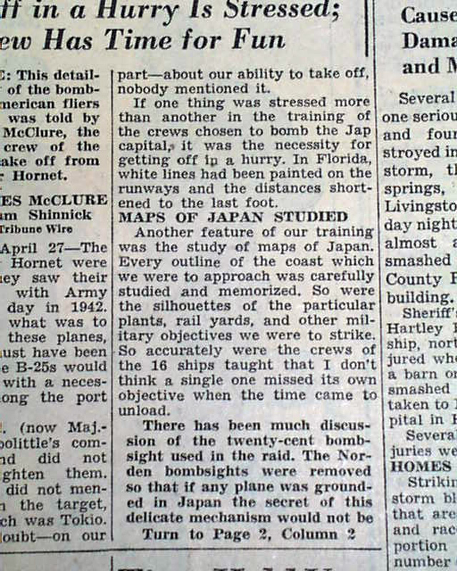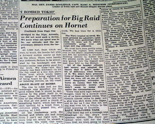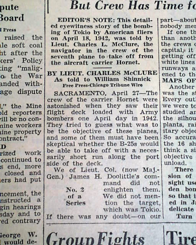 The front page has a two column heading: "A Buzzing Hornet Approaches Japan" with lead-in: "'I Bombed Tokyo" and subhead. Page 2 has a photo of the crew on the deck of the USS Hornet just before the raid. (see images) This was when the realization of who was responsible for the Jimmy Doolittle raid on Japan was made public. This famous event  happened about one year earlier.