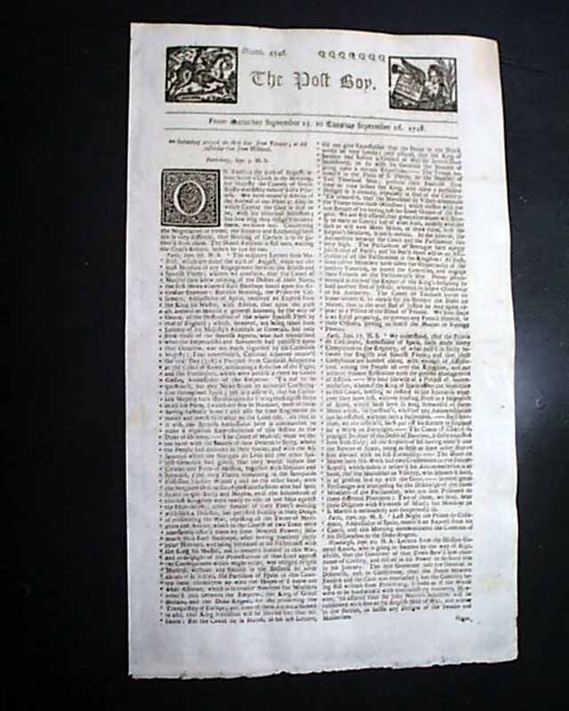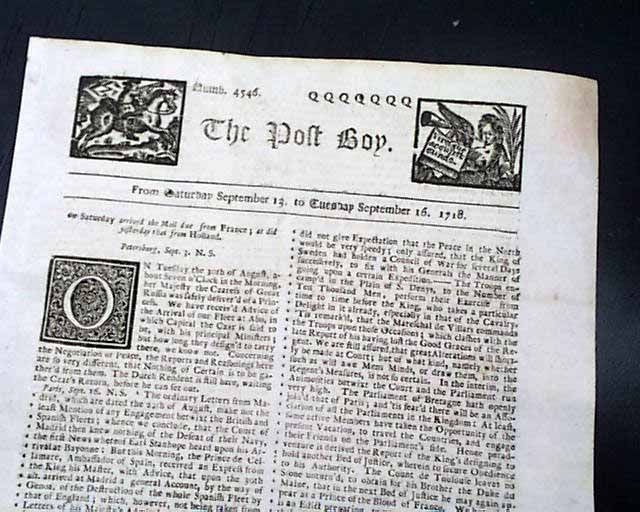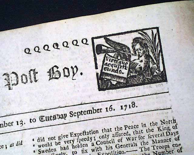 AI notes: The Post-Boy was a prominent London newspaper founded in 1695, emerging immediately after the lapse of the Licensing Act and continuing into the 1720s, and it is especially notable for its engraved masthead, a hallmark of early English journalism. The masthead typically featured a post-boy on horseback blowing a horn, sometimes accompanied by additional heraldic or allegorical figures, visually asserting the paper’s connection to the postal system and the rapid transmission of news at a time when information literally traveled by courier. Printed in a single-sheet format and issued several times a week, The Post-Boy carried domestic and foreign political news, court reports, commercial information, and advertisements, appealing to London’s growing literate public. Its woodcut engravings were not merely decorative but functioned as a brand identifier in an era of limited typography, helping readers quickly recognize the paper at stalls and coffeehouses. Along with titles such as The Flying Post, The Post-Boy exemplifies how early newspapers used masthead imagery to symbolize speed, reliability, and authority in news delivery, making it an important artifact in the visual and cultural history of the British press.