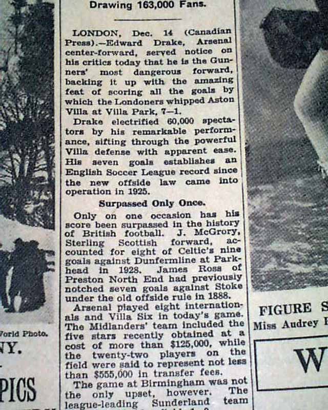 Page 4 of this section has a one column heading: "SOCCER MARK SET AS 60,000 LOOK ON" with subheads that include: "Seven Goals by Drake of Arsenal Best Under English League's New Rule" and more. (see)