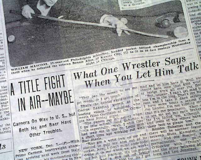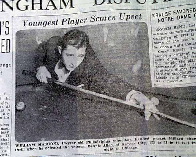 Page 3 (pg. 27) of this section has a three column photo showing a young Willie Mosconi with heading: "Youngest Player Scores Upset" Also a related report with one column heading: "GREENLEAF OUT OF FIRST PLACE" with subhead. (see images)