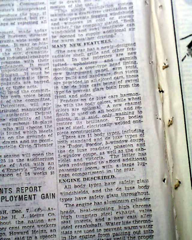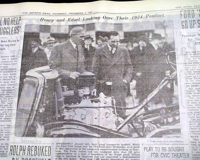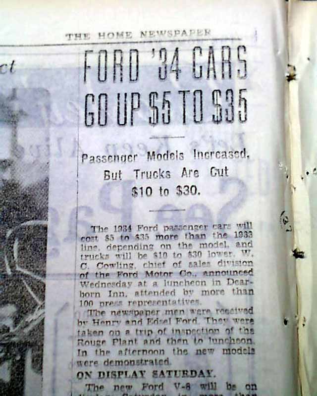 Page 4 has a four column photo showing Henry & Edsel Ford inspecting their new Ford release for 1934 with text. Also a one column heading: "FORD '34 CARS GO UP $5 TO $35" with subhead. (see images) Probably only found in the Detroit publication, very rare as such. A perfect addition for someone who owns this particular model.
