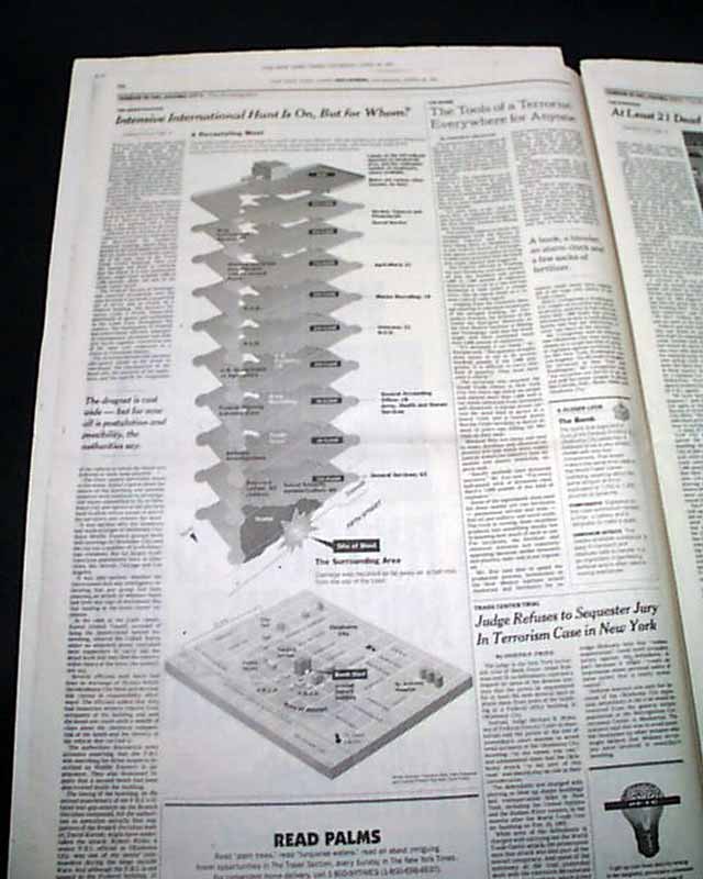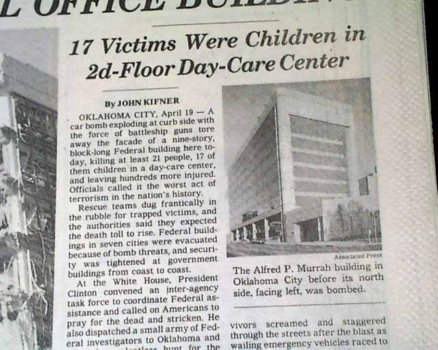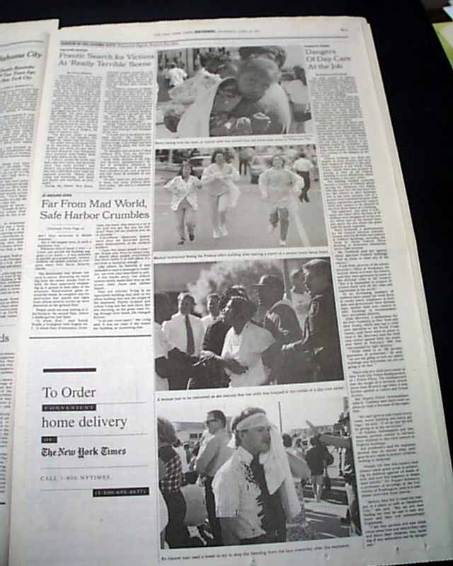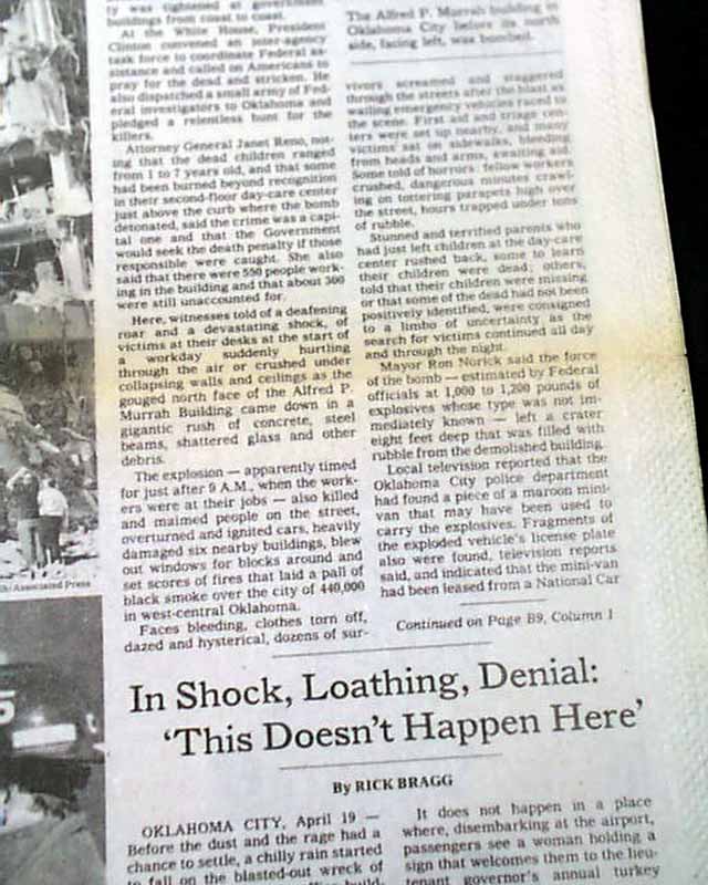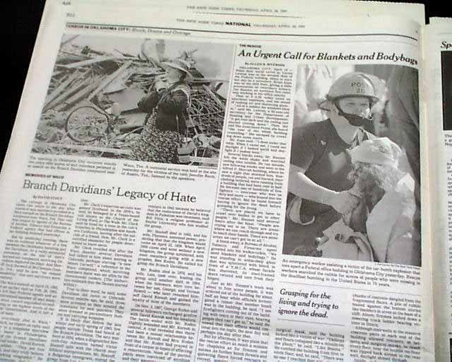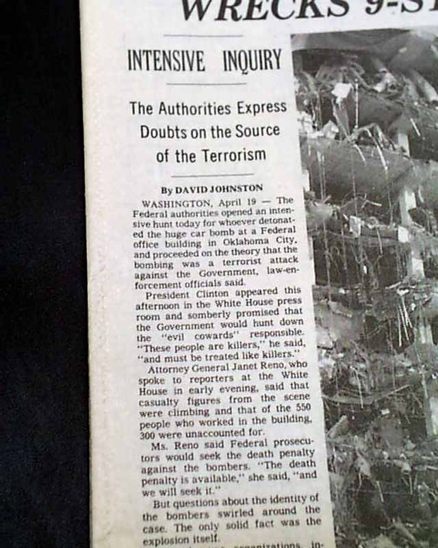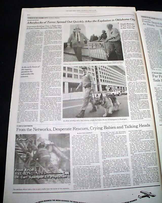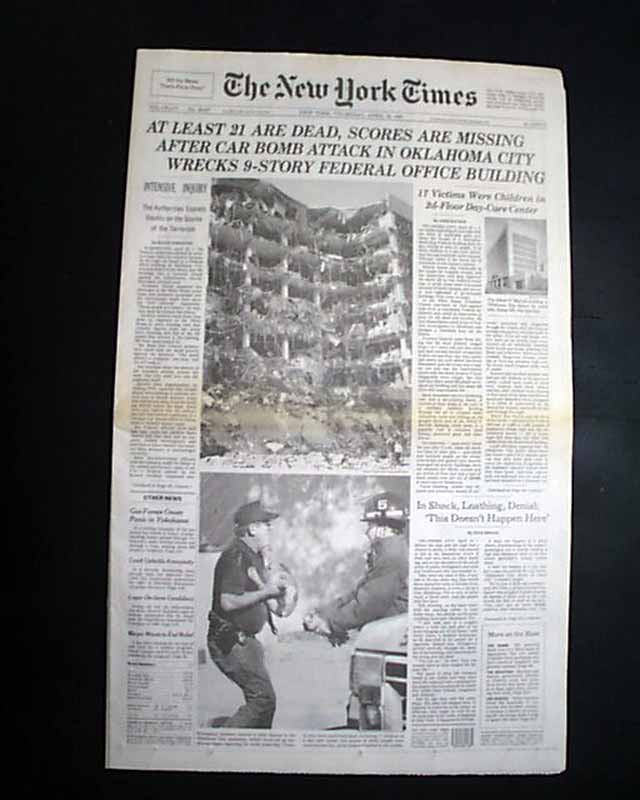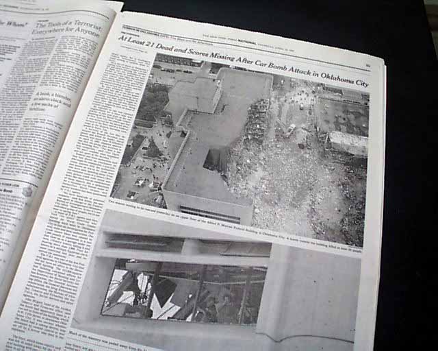 The top of the front page has a nice banner headline: "AT LEAST 21 ARE DEAD, SCORES ARE MISSING AFTER CAR BOMB ATTACK IN OKLAHOMA CITY WRECKS 9-STORY FEDERAL OFFICE BUILDING" with subheads and three related photos. (see images) Much more inside.