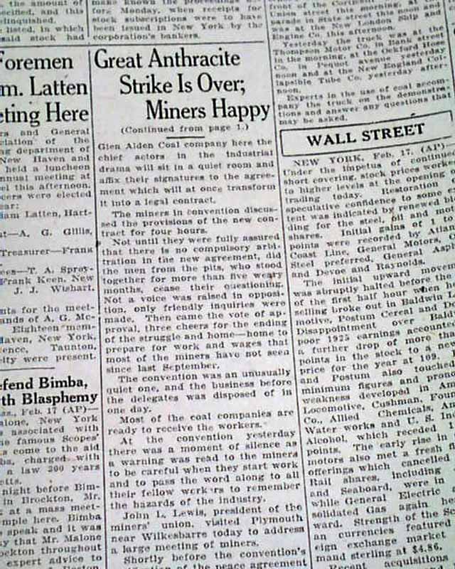 The front page has a one column heading: "Great Anthracite Strike Is Over; Miners Happy" (see images)