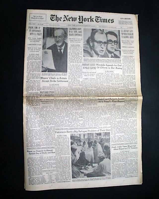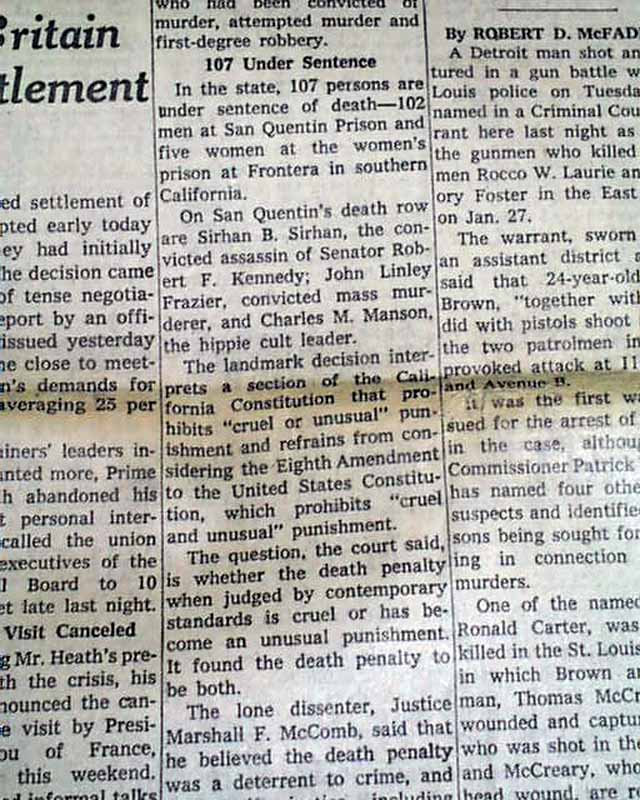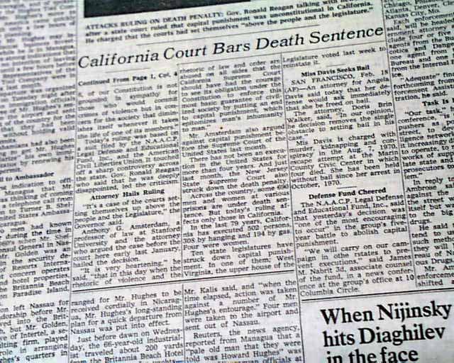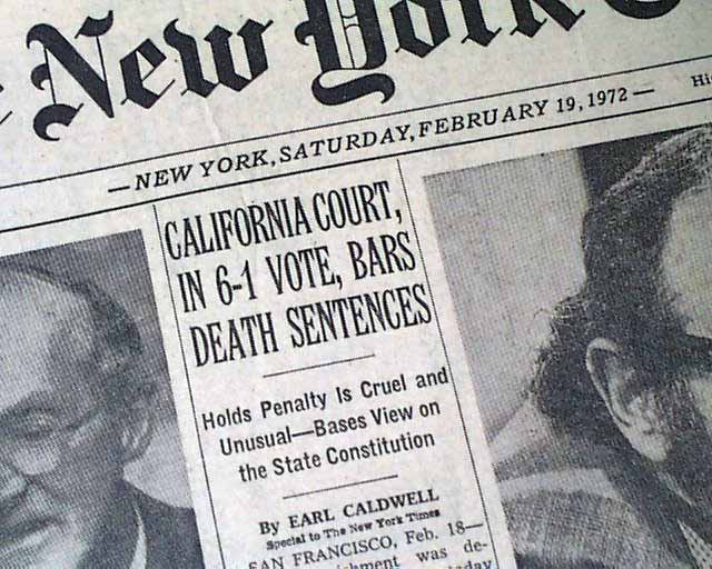 The top of the front page has a one column heading: "CALIFORNIA COURT, IN 6-1 VOTE, BARS DEATH SENTENCES" with subhead. (see images) Mention of a few notable death row inmates that benefited by this decision that includes cult killings mastermind Charles Manson.