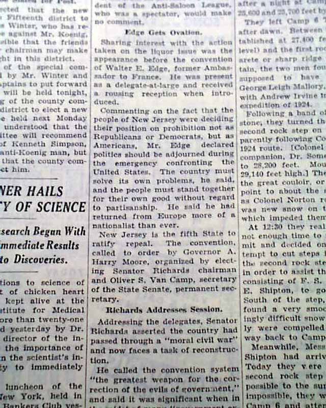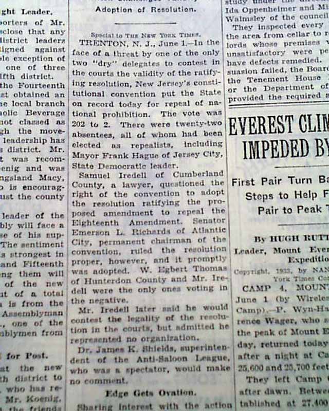 Page 21 has a one column heading: "REPEAL IS RATIFIED IN JERSEY SESSION" with subheads. (see images)