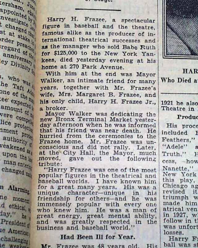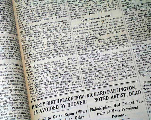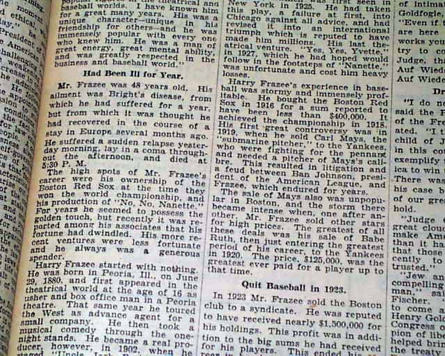 Page 29 has a one column heading: "H. H. FRAZEE DIES SUDDENLY AT 48" with subheads and photo. (see images)  He was known for selling Babe Ruth to the Yankees thus starting the Curse of the Bambino.
